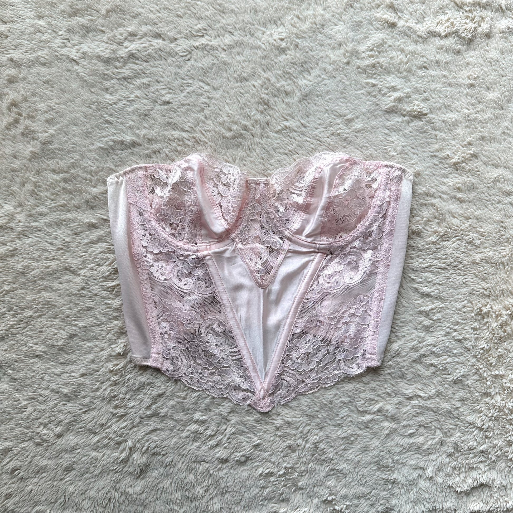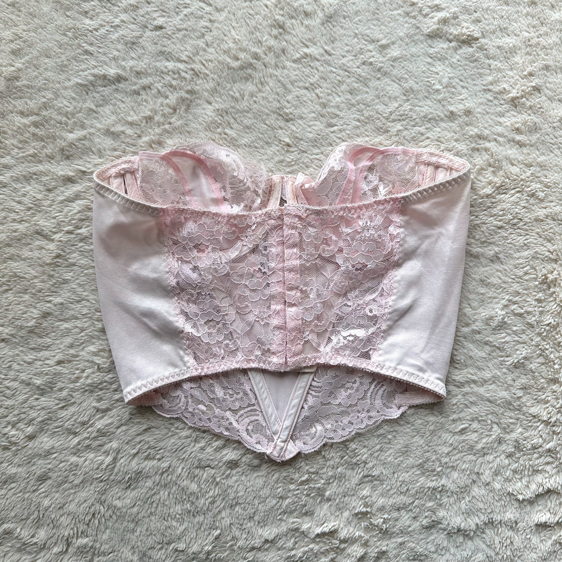 light pink satin corset with matching floral lace inset panels, boning and underwire for a flattering fit, and hook and eye style closures in the back