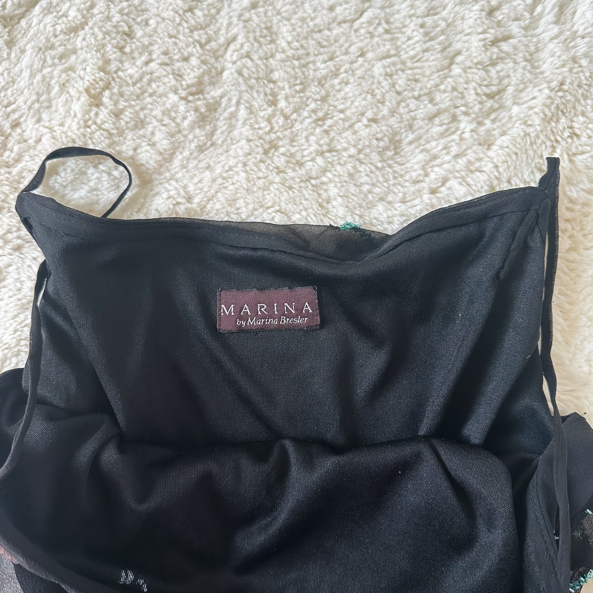 black chiffon gown with sequin floral detailing in amethyst purple, sapphire blue, and light gold growing from emerald green vines