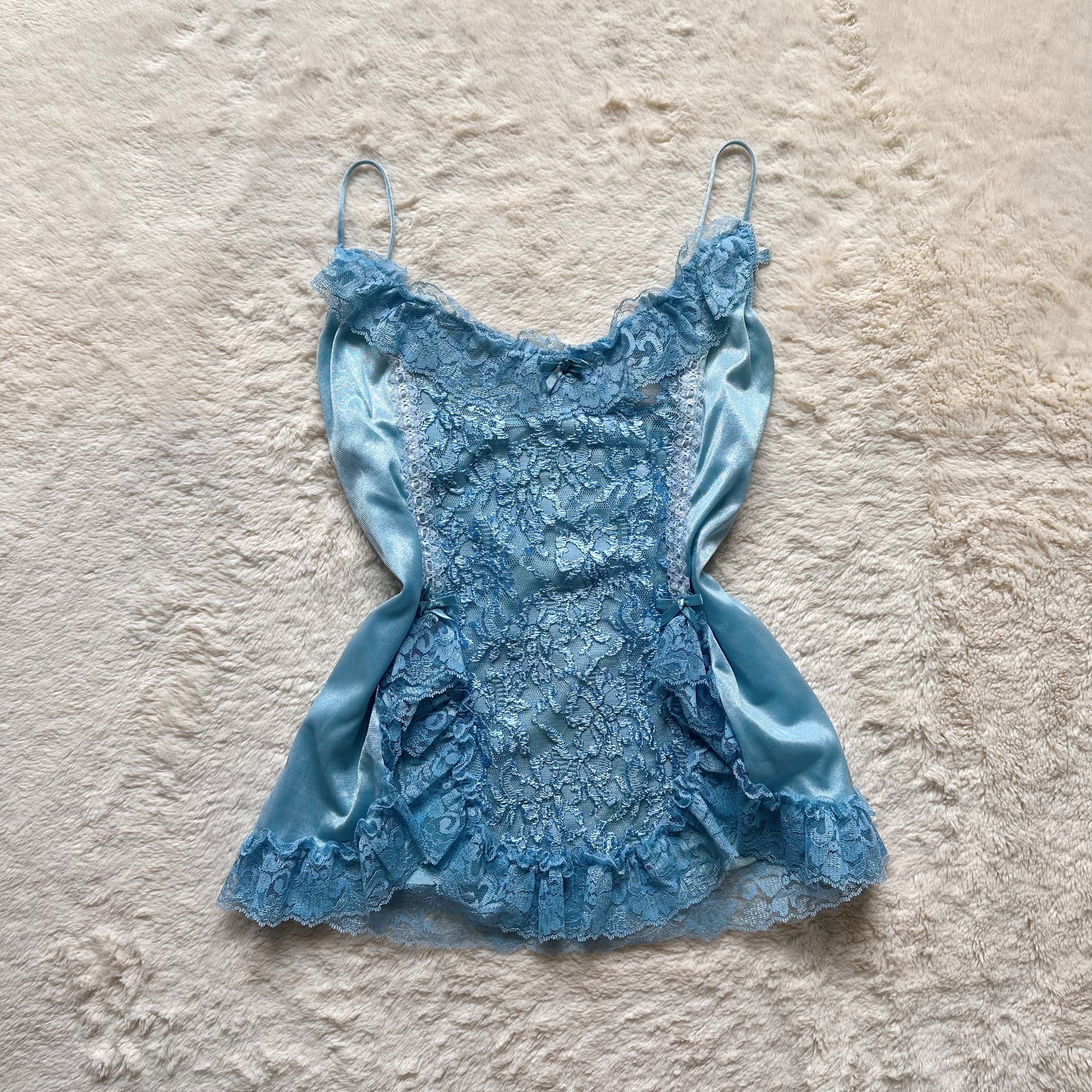 blue satin camisole with floral lace detailing, ruffle trim, and baby bow details