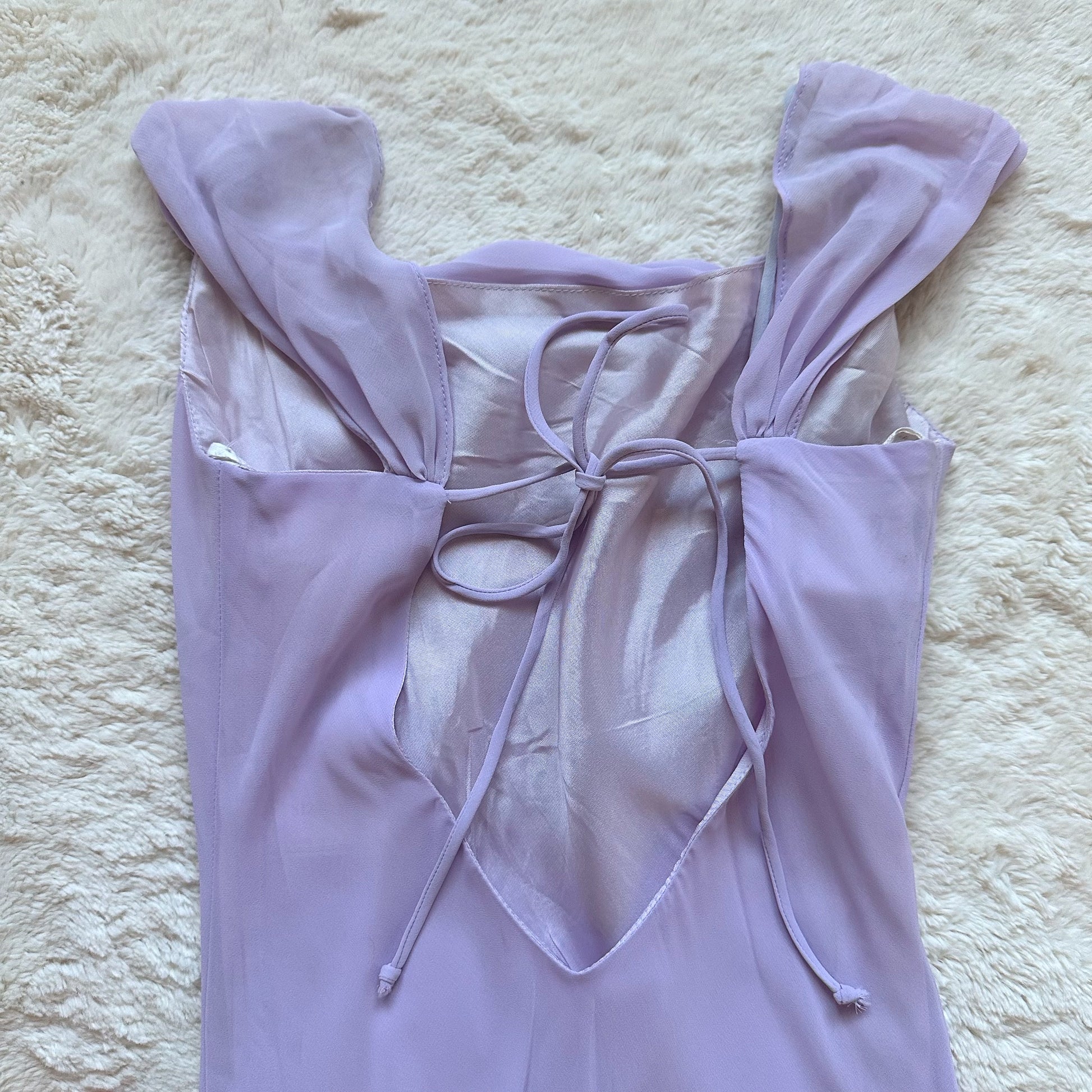 light lilac chiffon gown with dainty cap sleeves, rhinestone brooch details, and an open back with a functional tie
