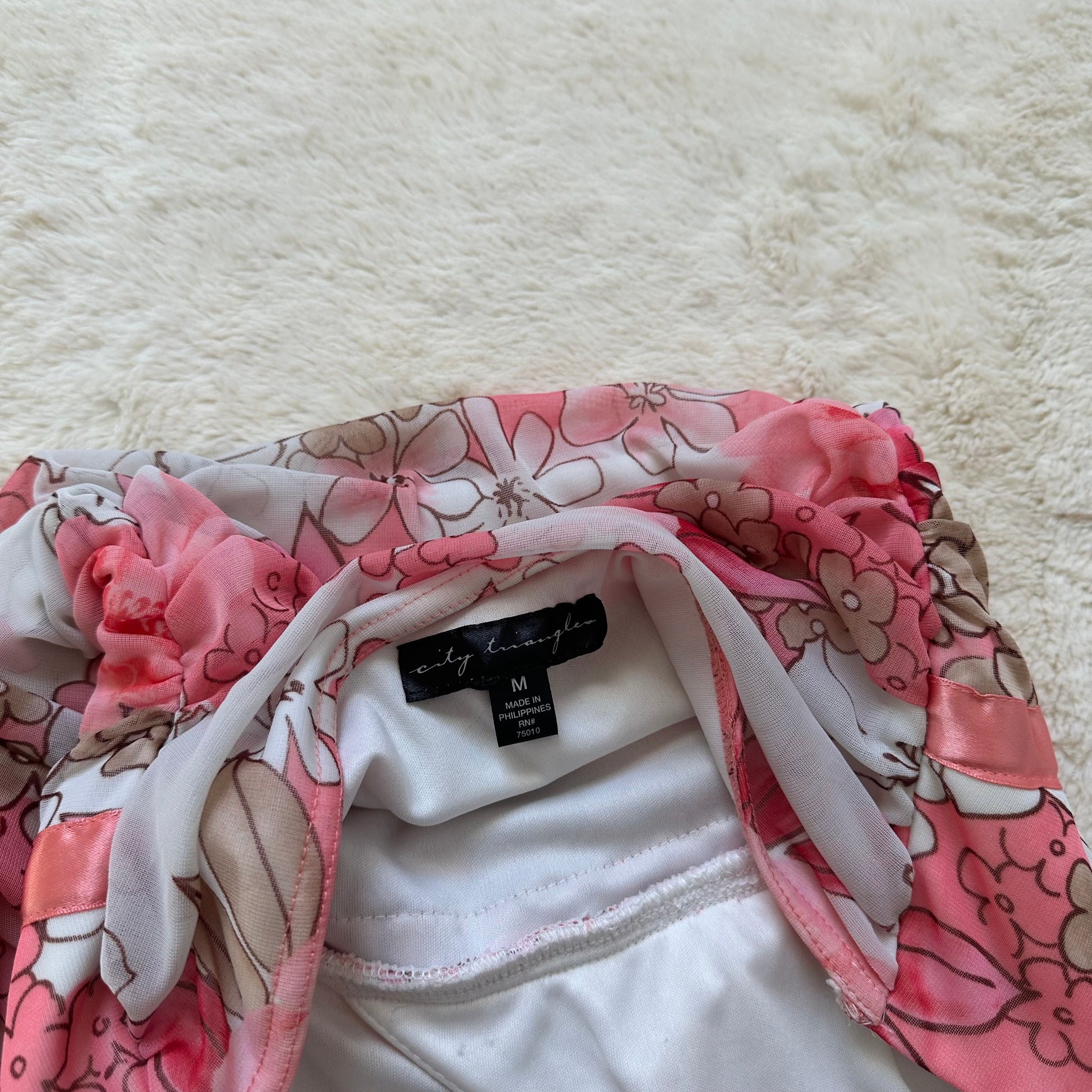 white halter style dress with pink and nude floral details, ruching around the waist, and a satin trim, completed with a cascading hem