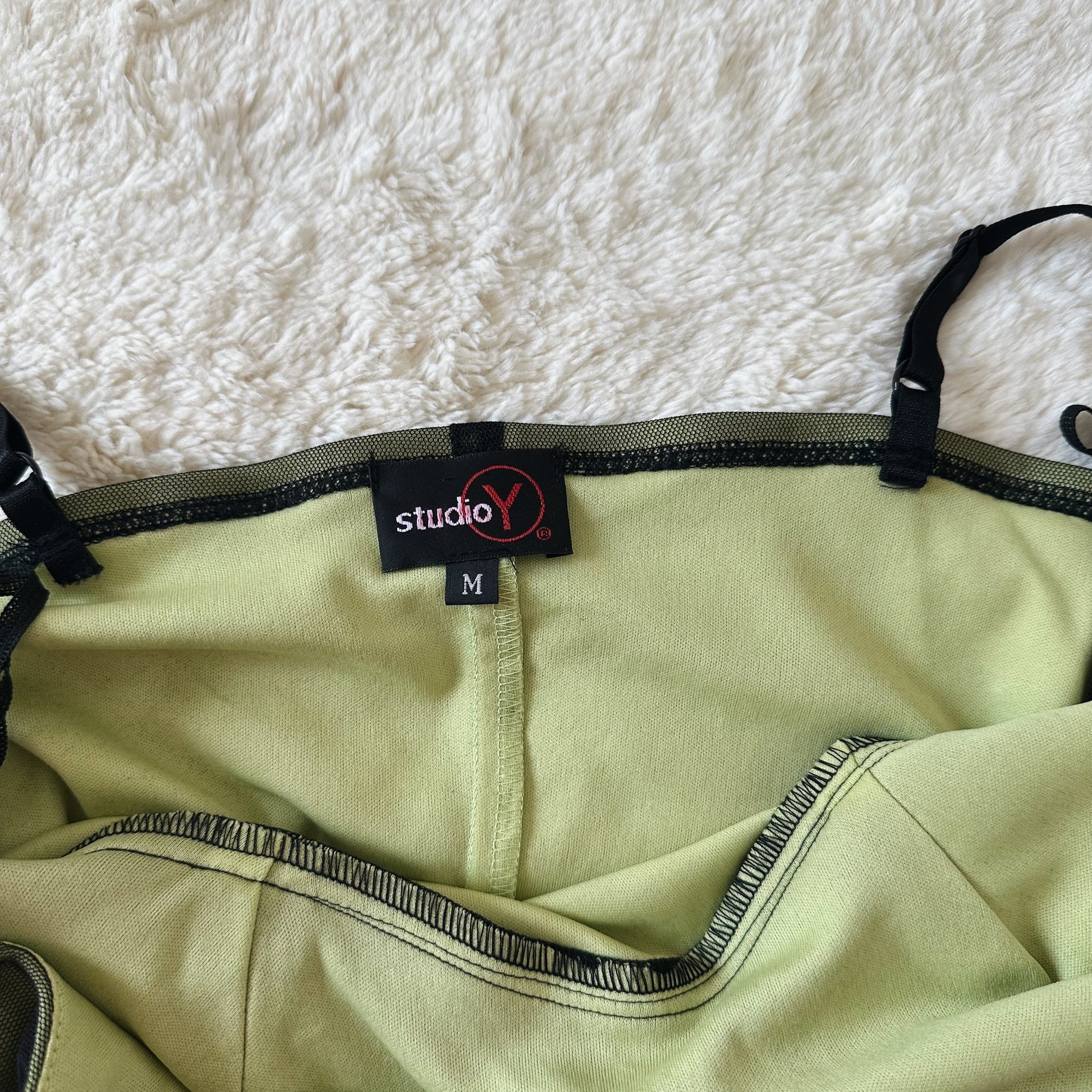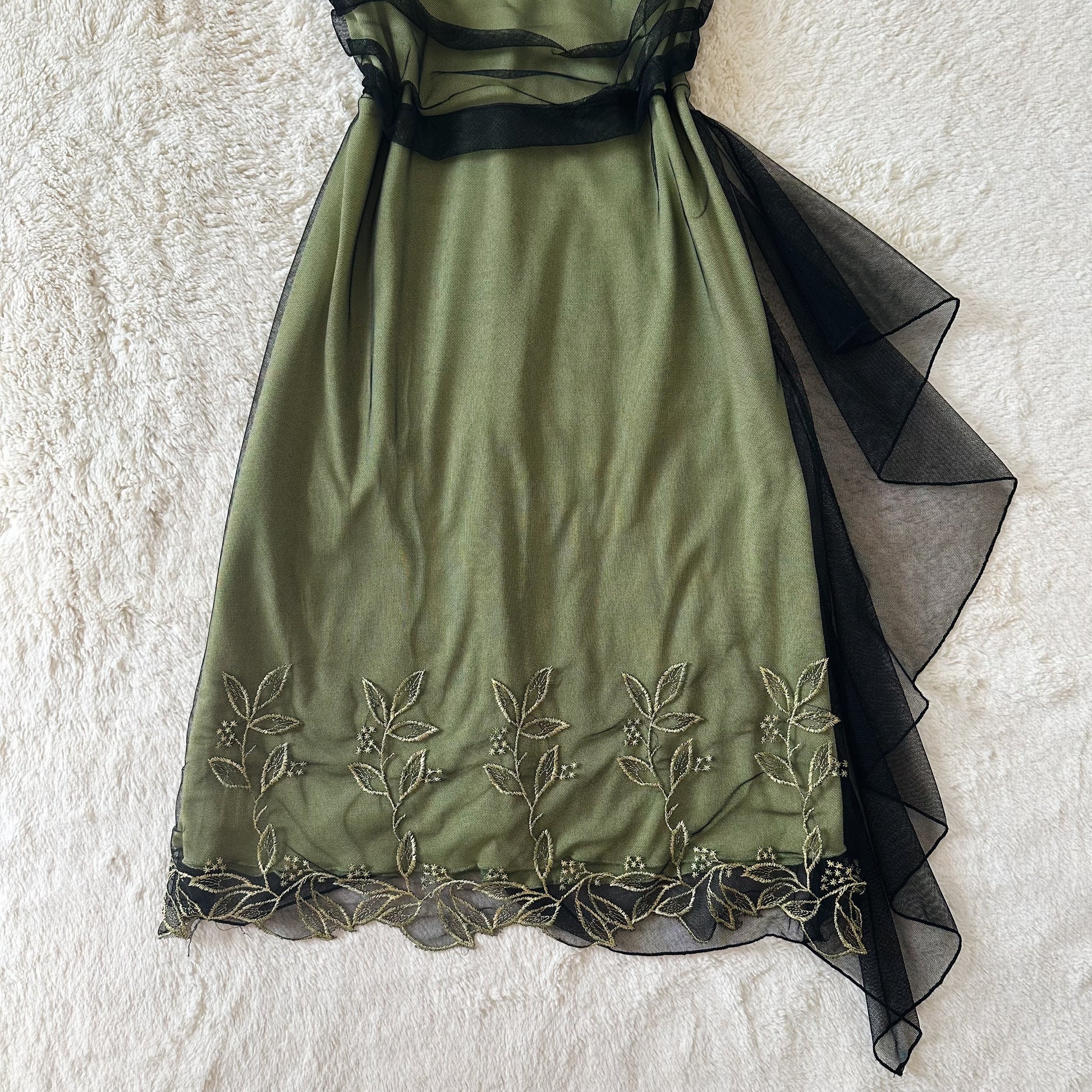 witchy green dress with black tulle overlay, vine embroidery at the hem, and waterfall style draping, completed with a silver and green rhinestone brooch on one strap