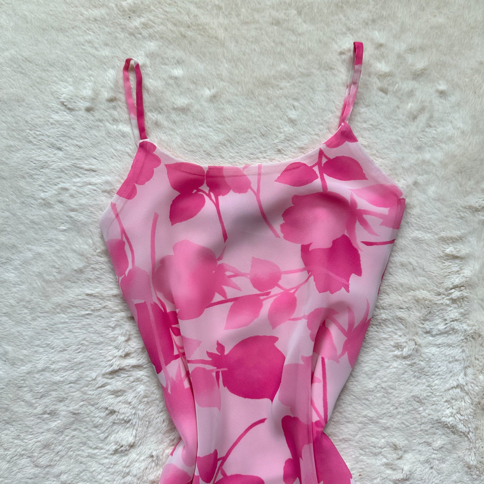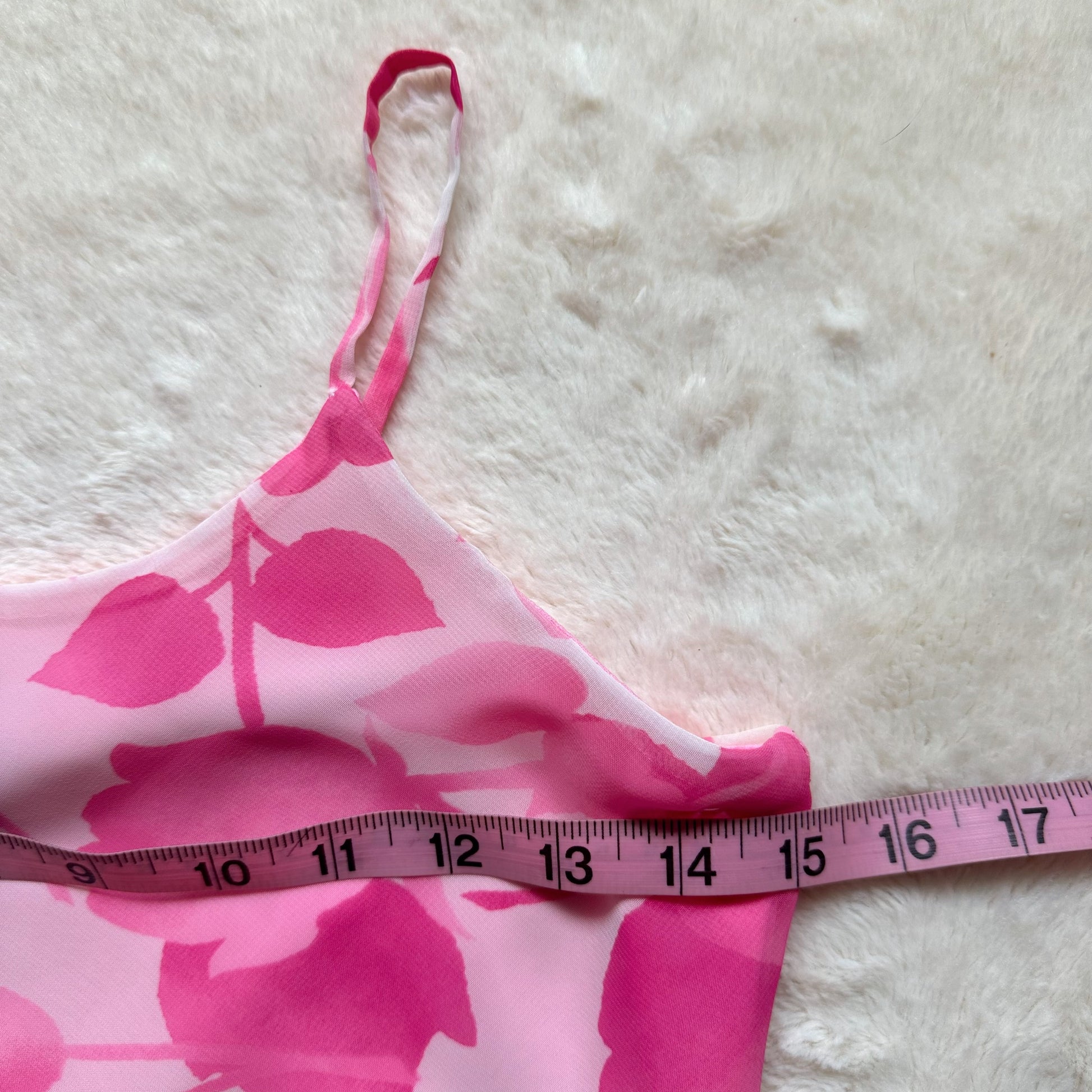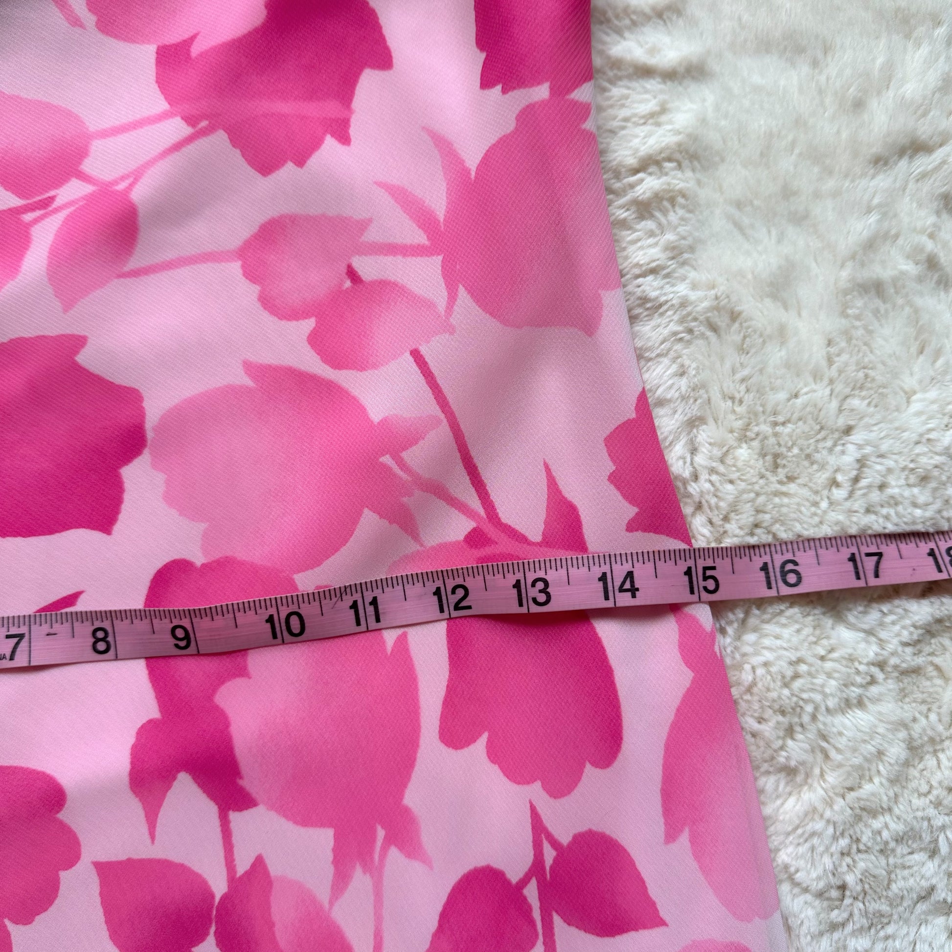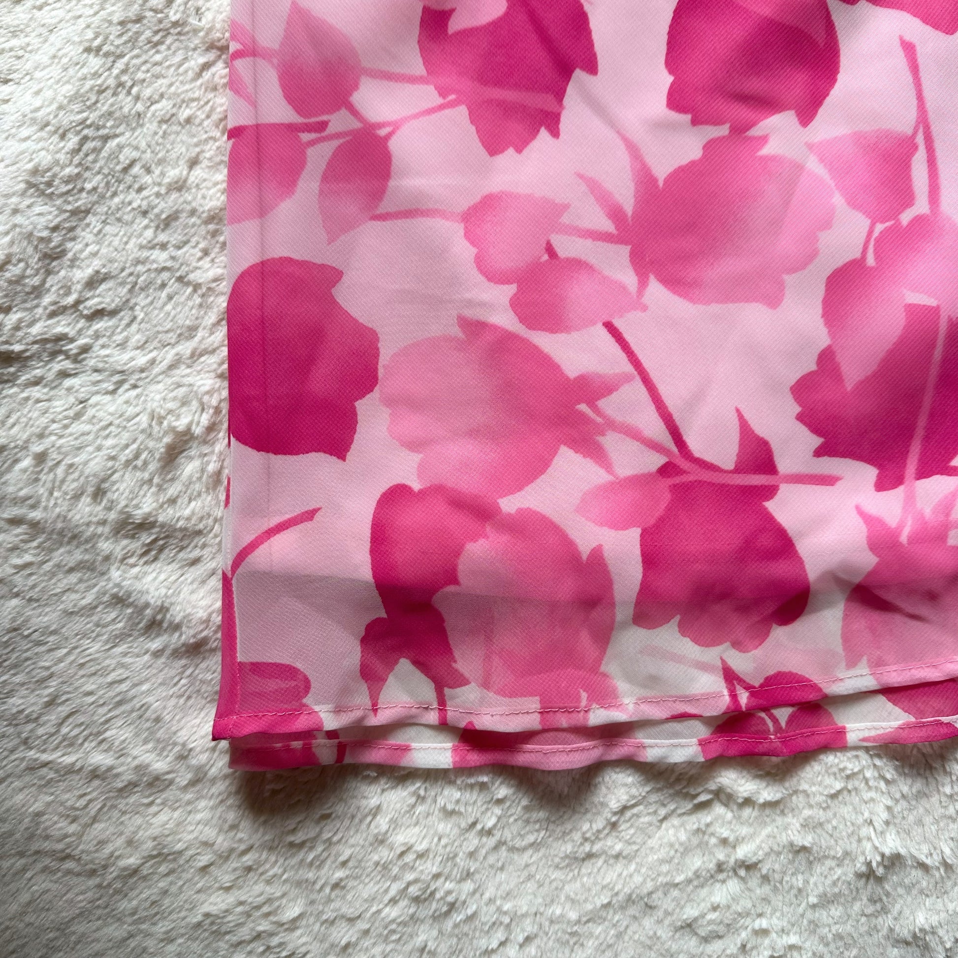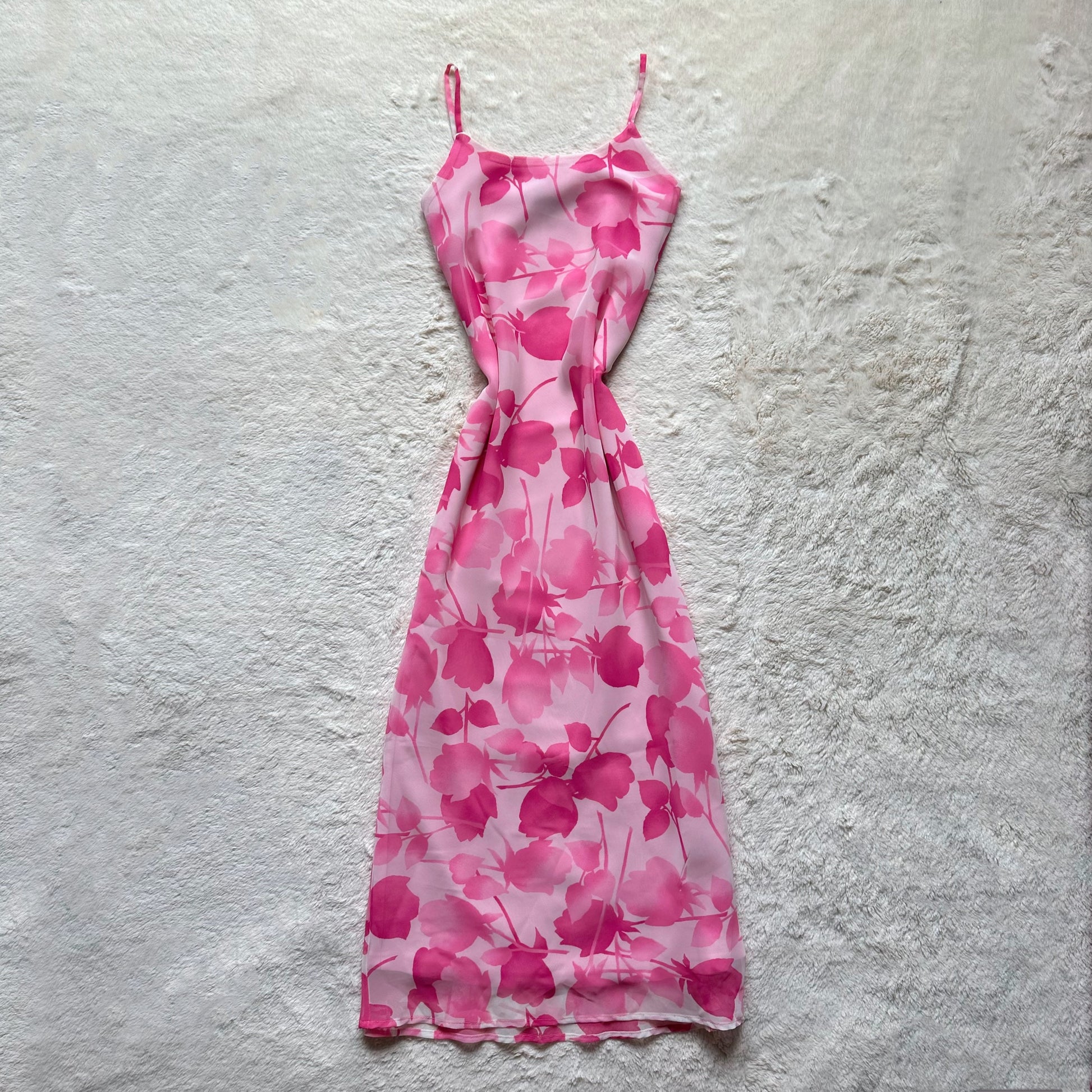 light pink dress with a chiffon top layer with all-over contrasting pink tulip and petal print