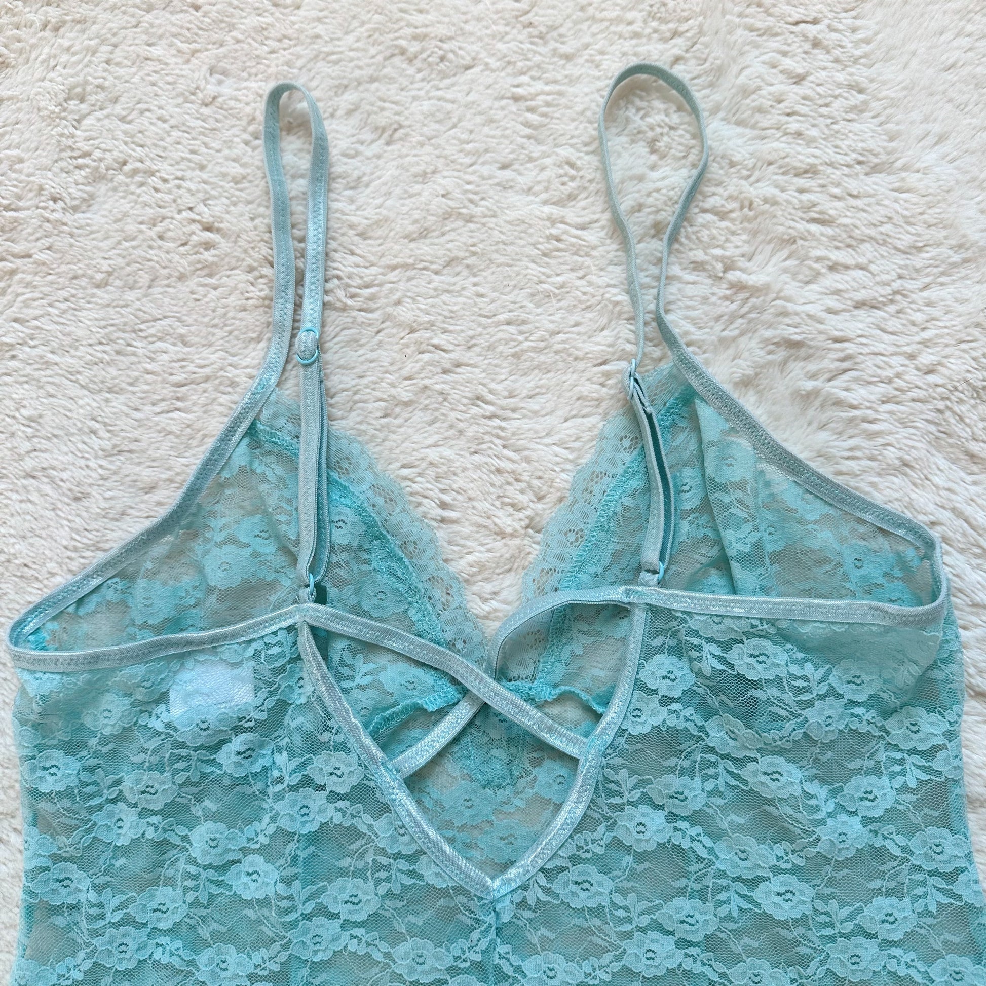 aqua blue sheer floral lace slip dress with a slit at one side and criss cross strappy detail in the back