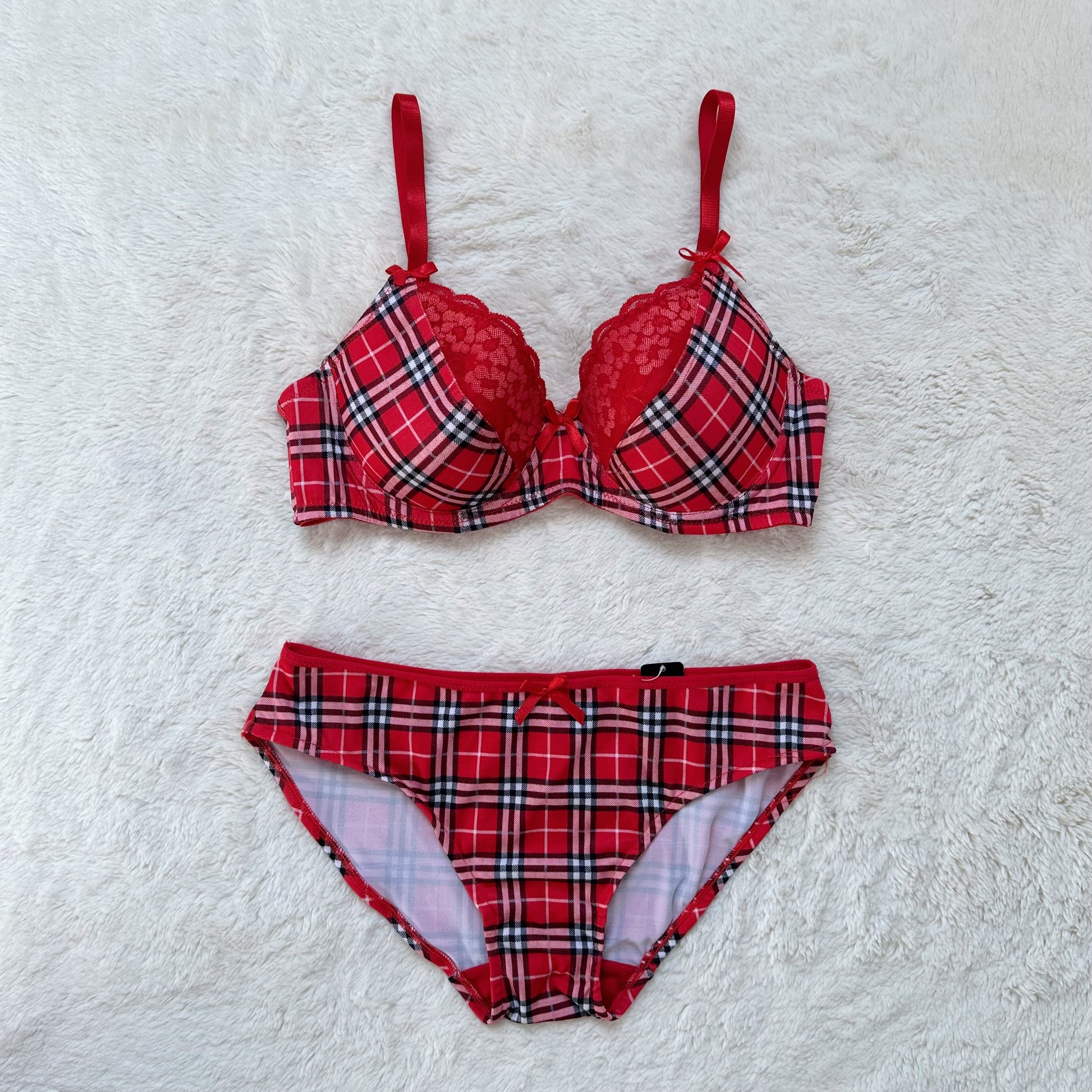 red, black, and white flannel print bra with baby bow appliqués, floral lace detailing, and matching panties to pair with