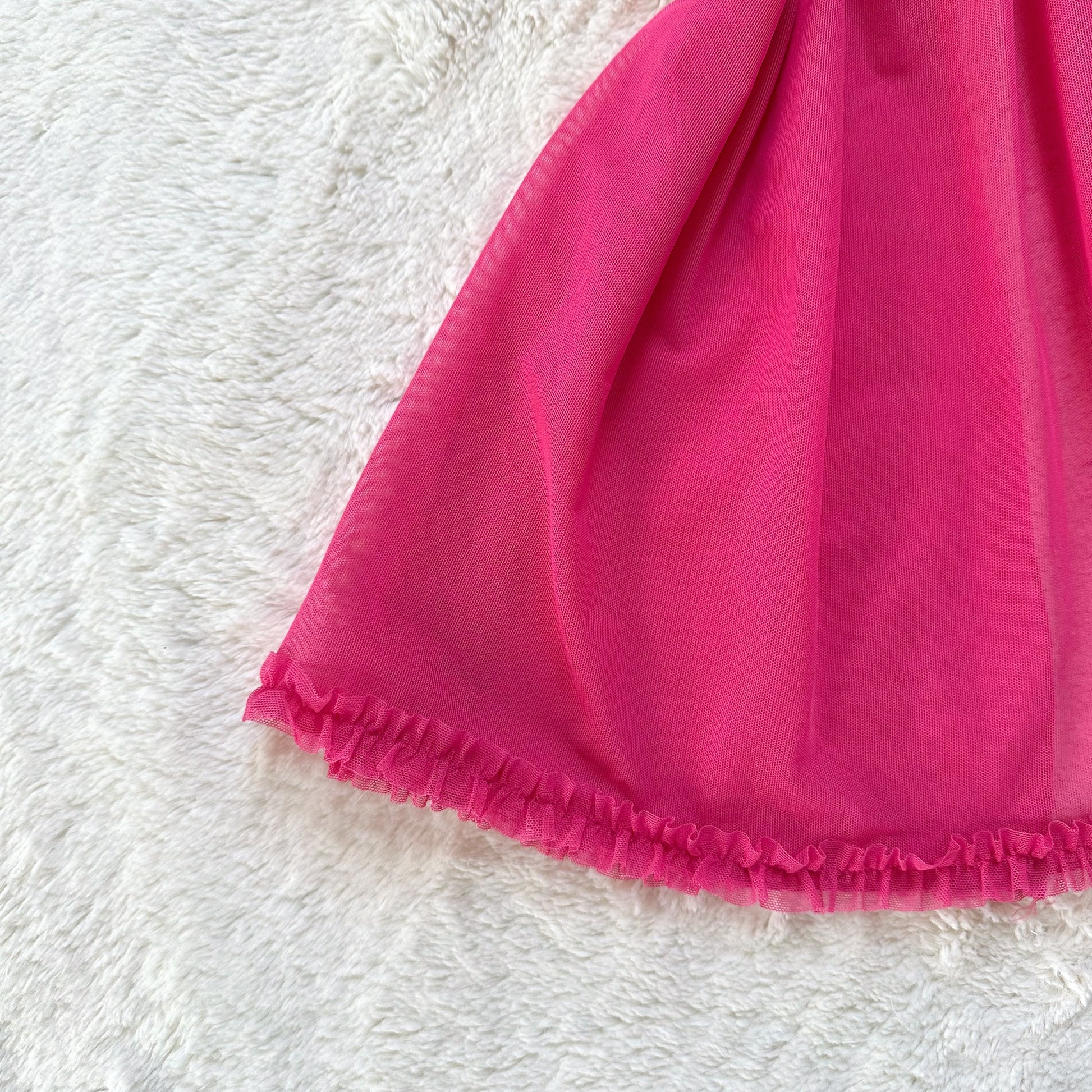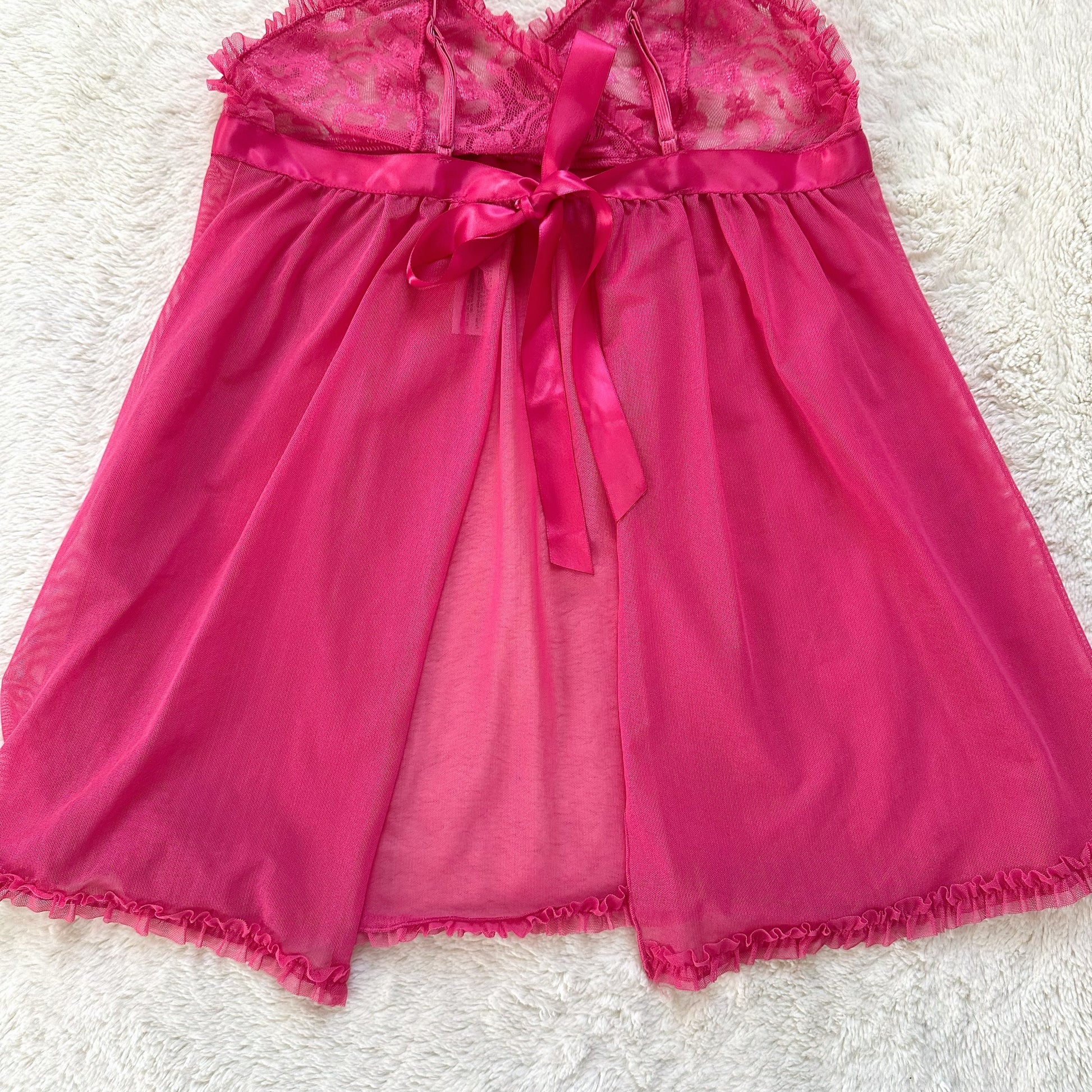 hot pink sheer mesh slip dress with floral lace cups, ruffle accents, and satin trim below the bust, completed with an open back and functional tie detail