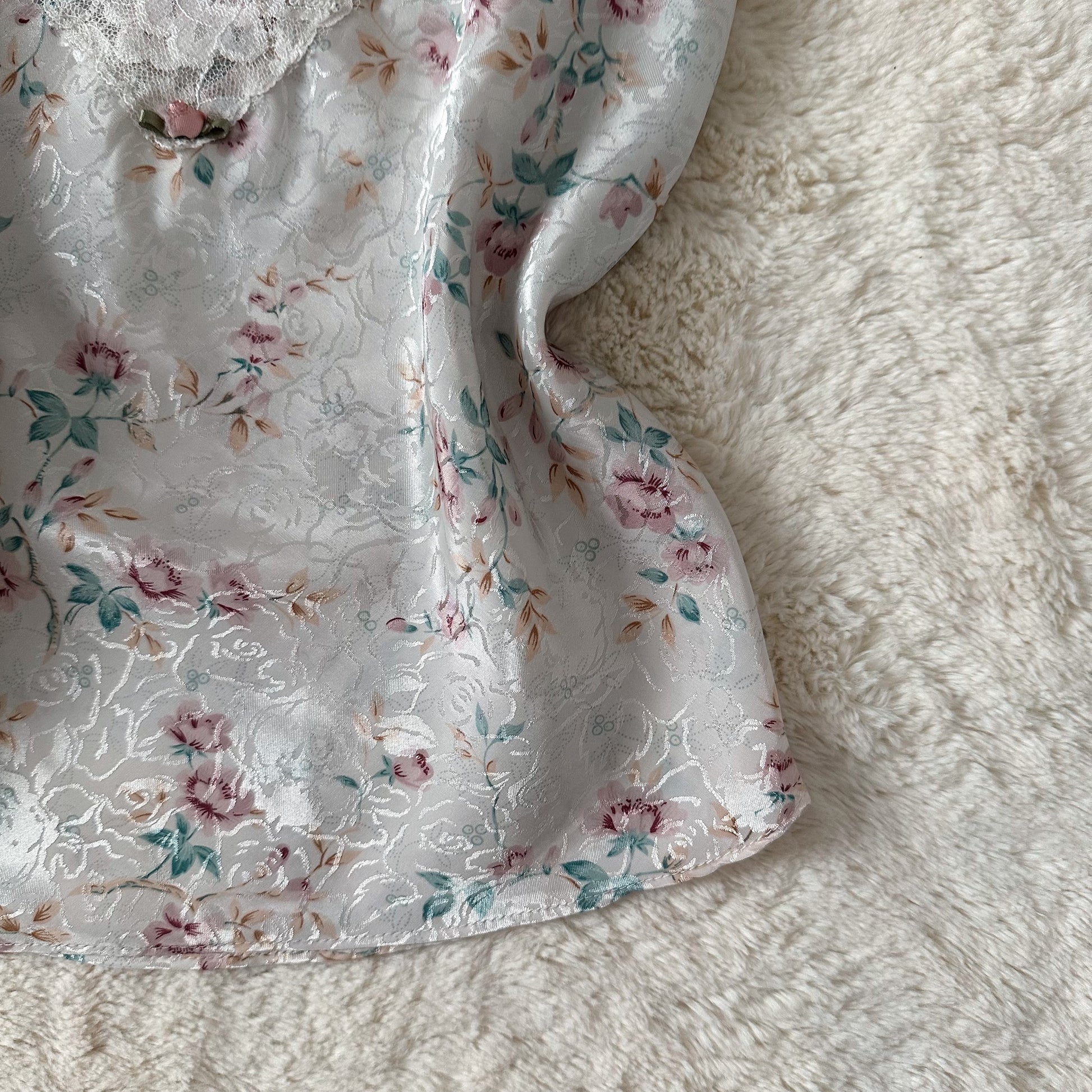 light grey satin camisole with plum and teal florals, lace trim, and a dainty rosette in the center