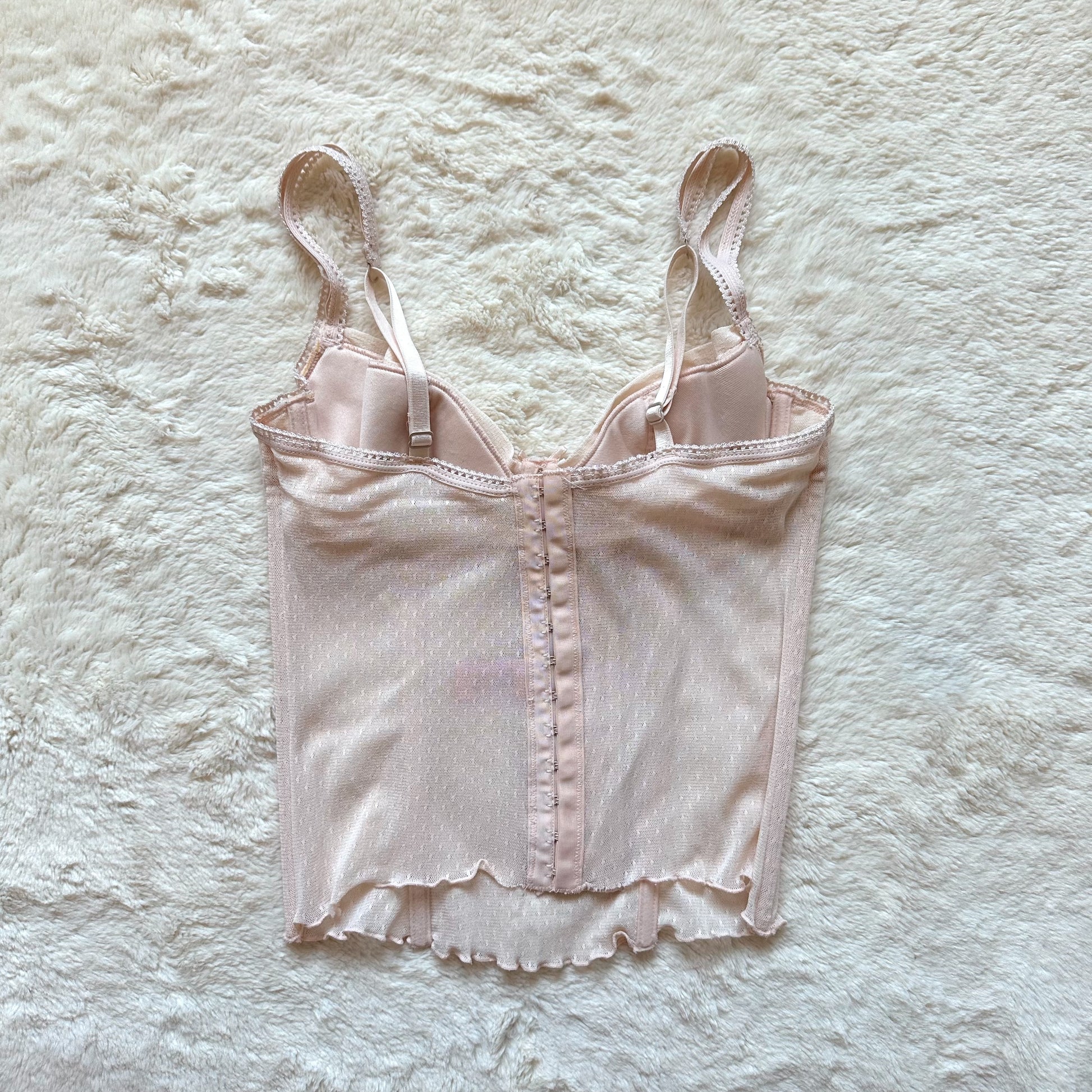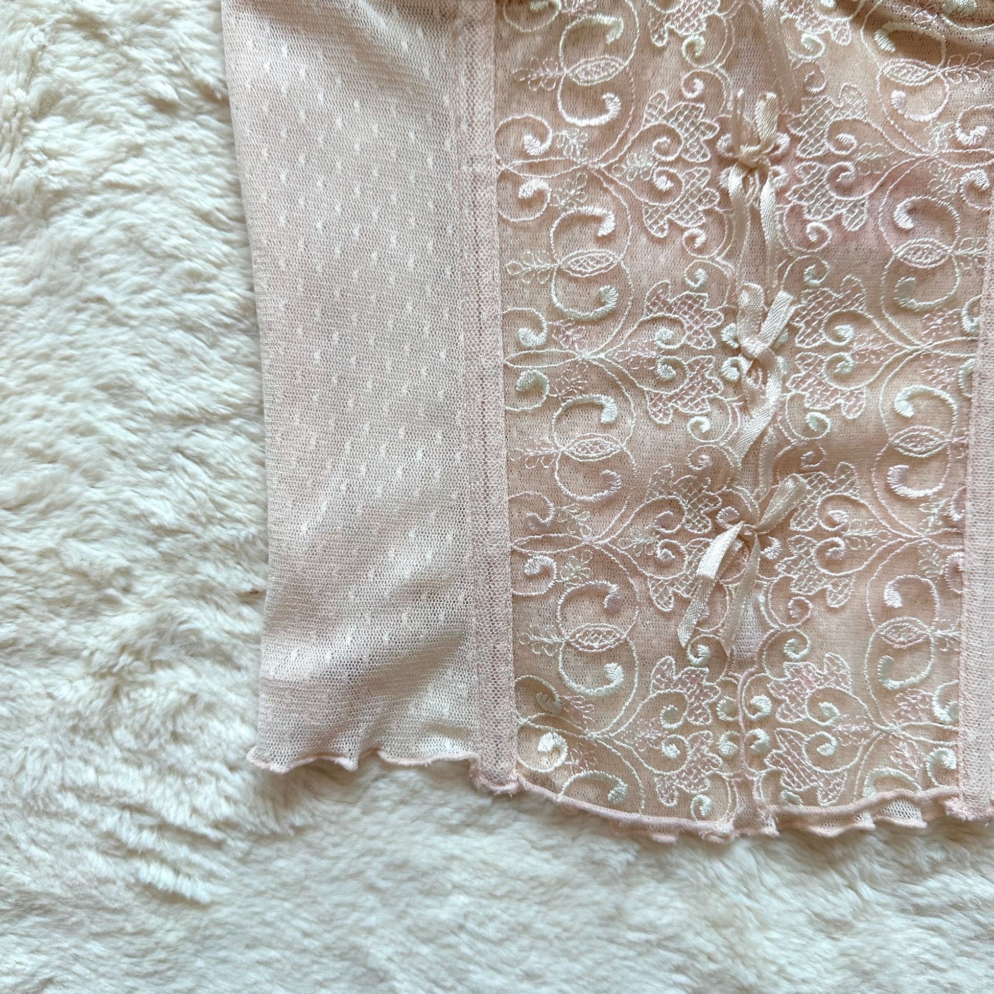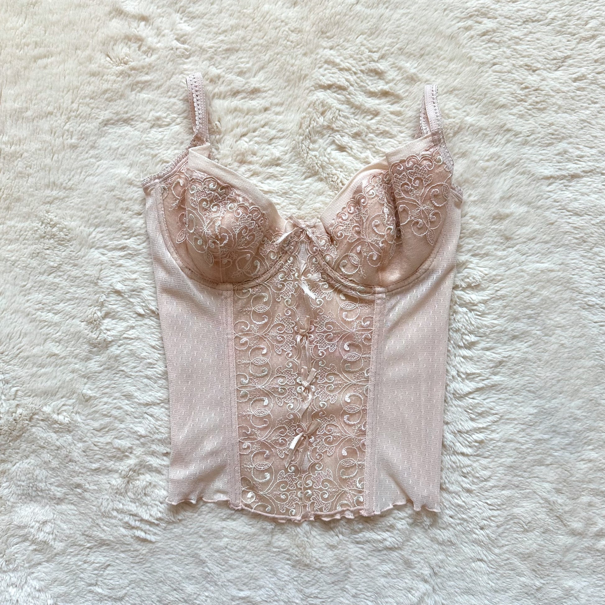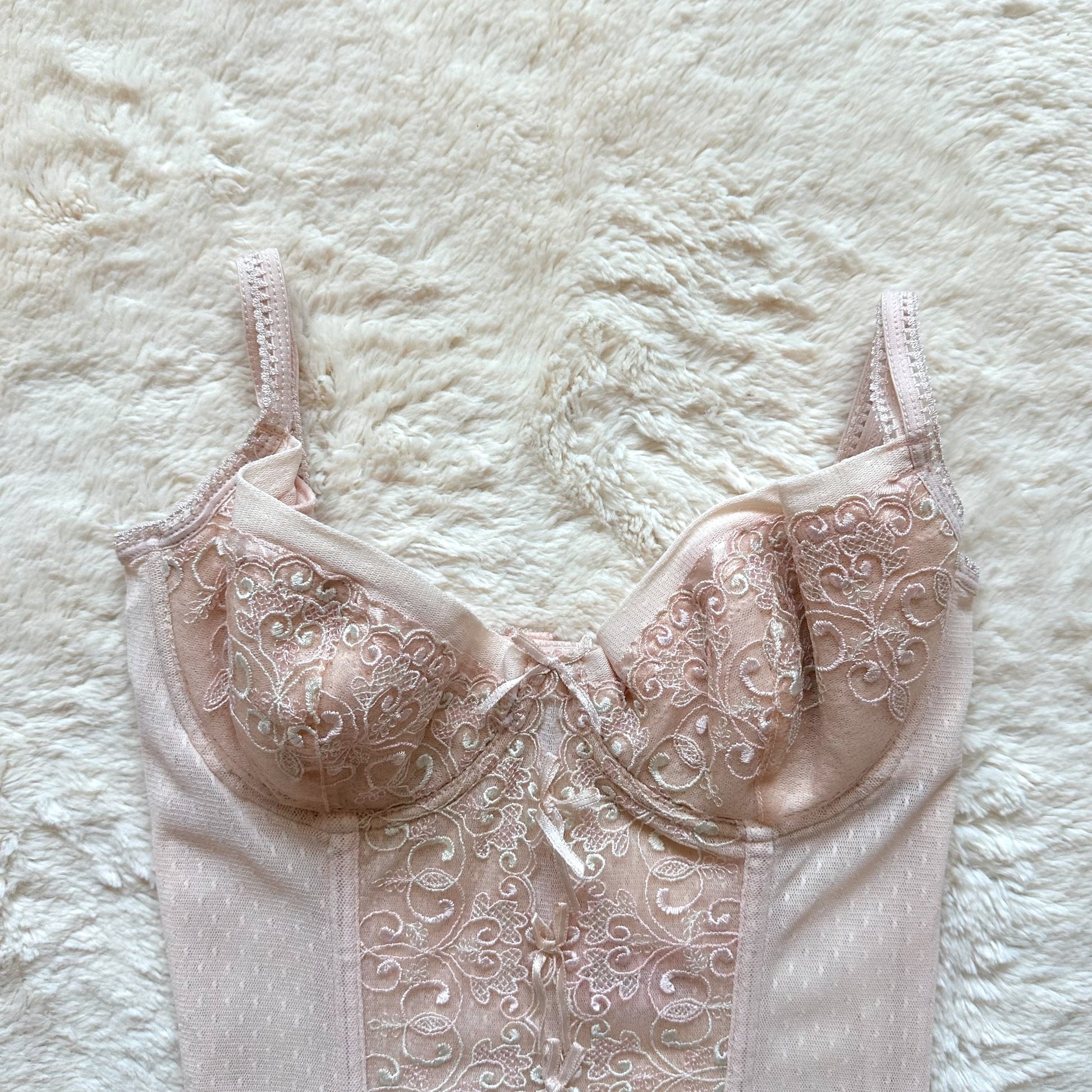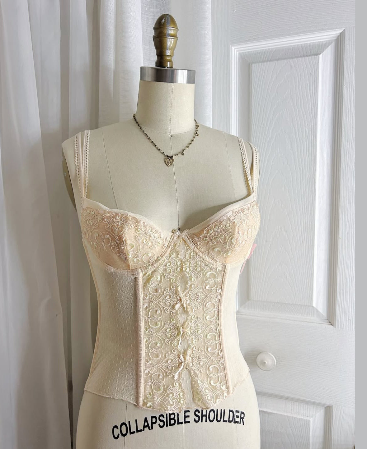 sheer cream swiss dotted mesh bustier top with light green and pink floral embroidery, dainty bows lining the center, and picot lace straps, finished with adjustable straps and hook and eye closures in the back