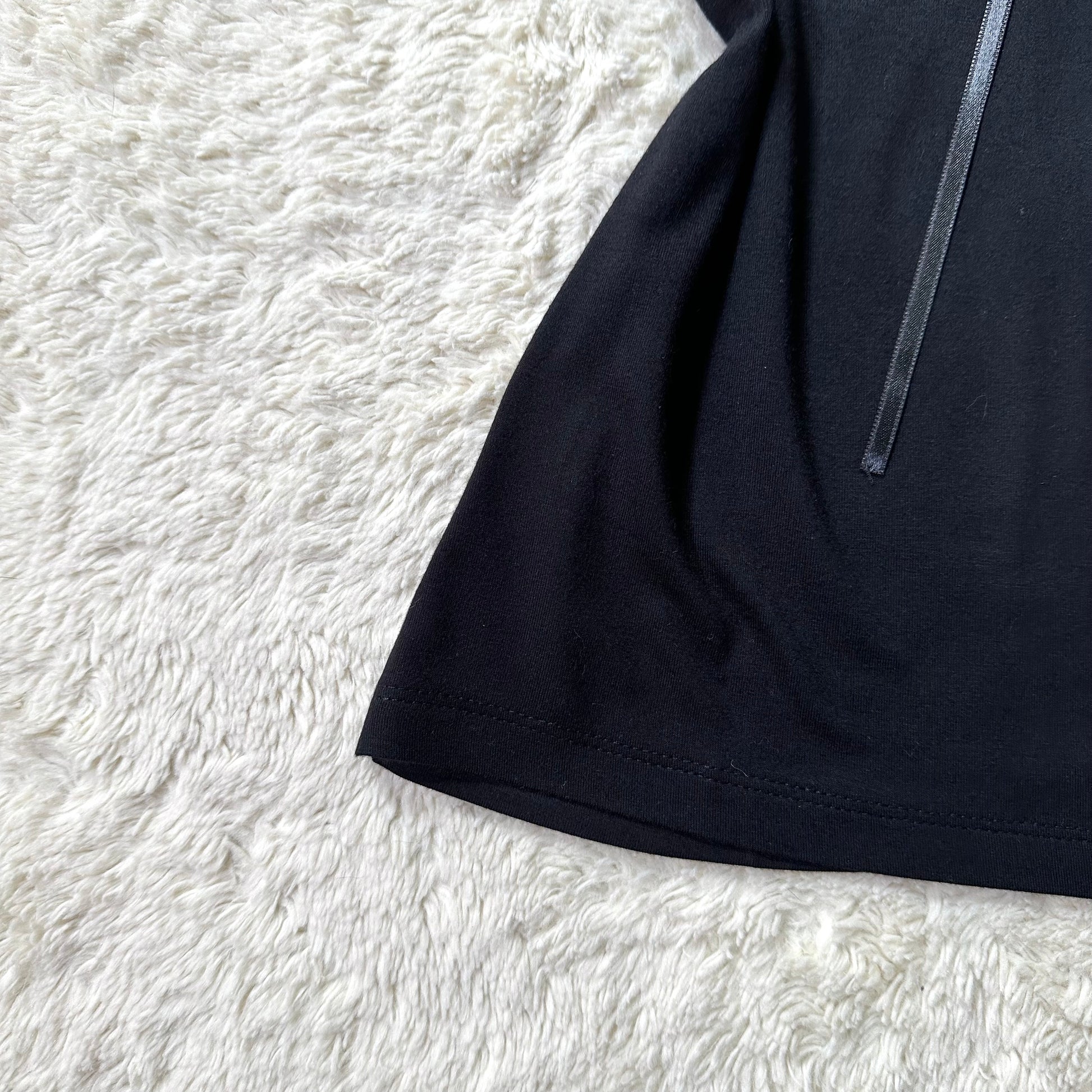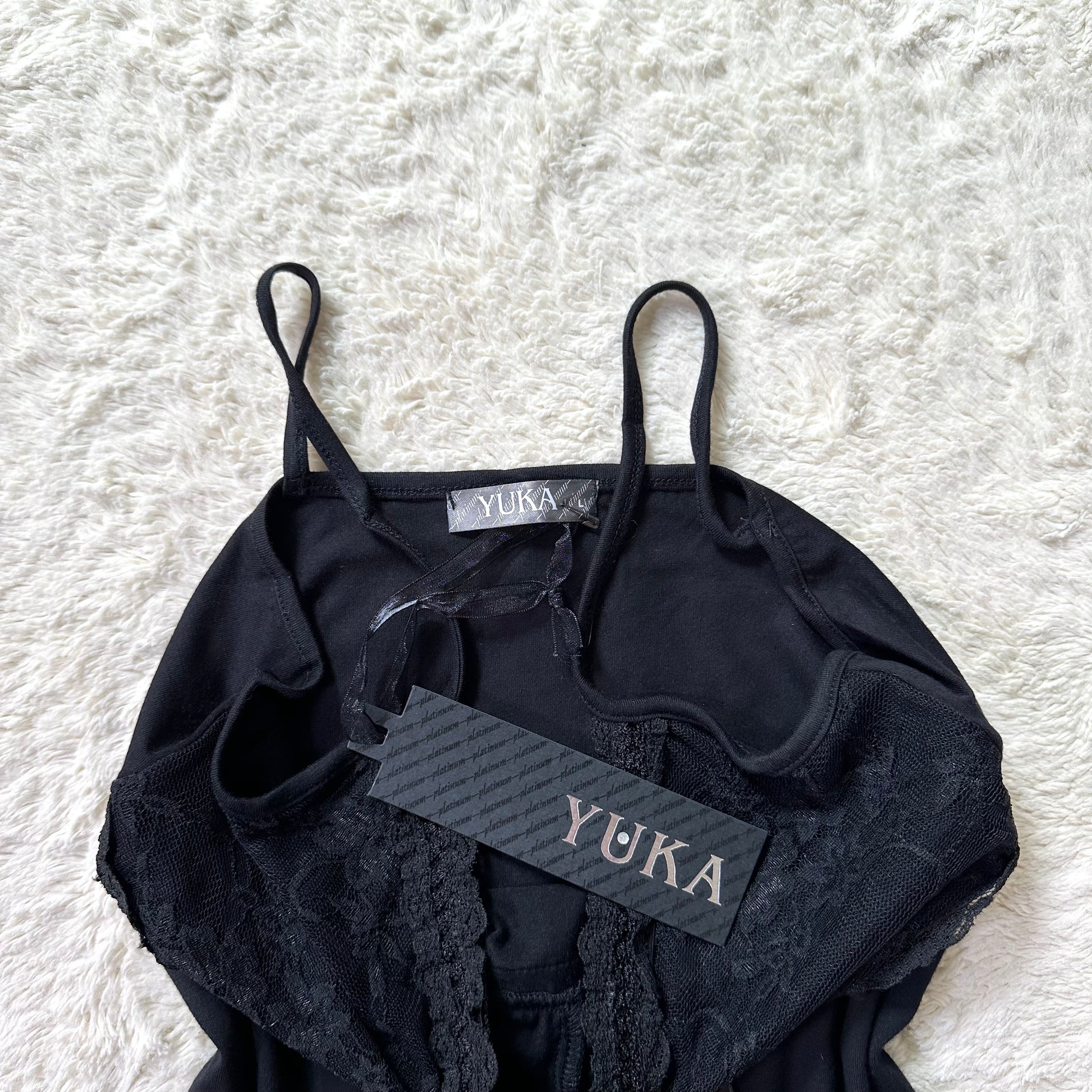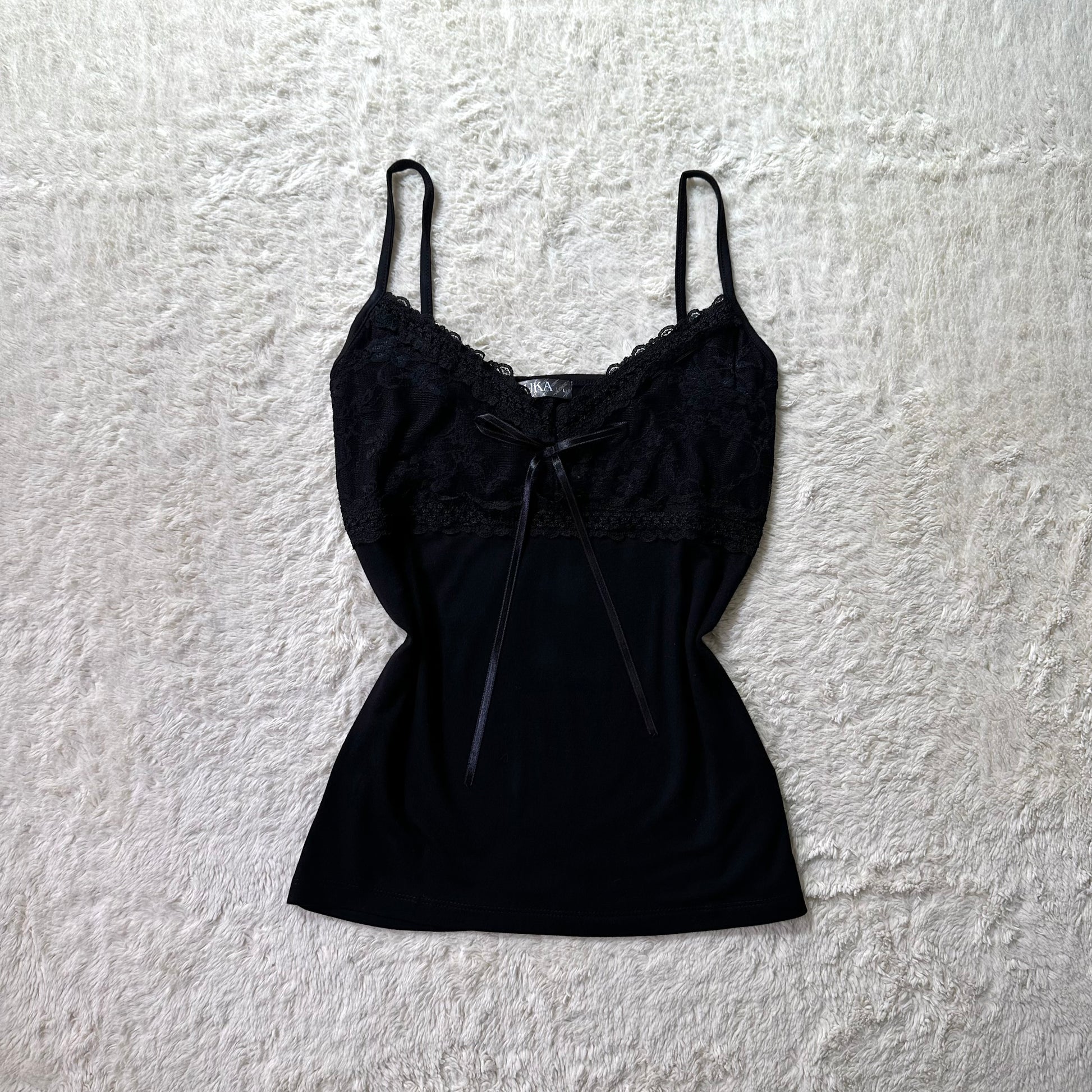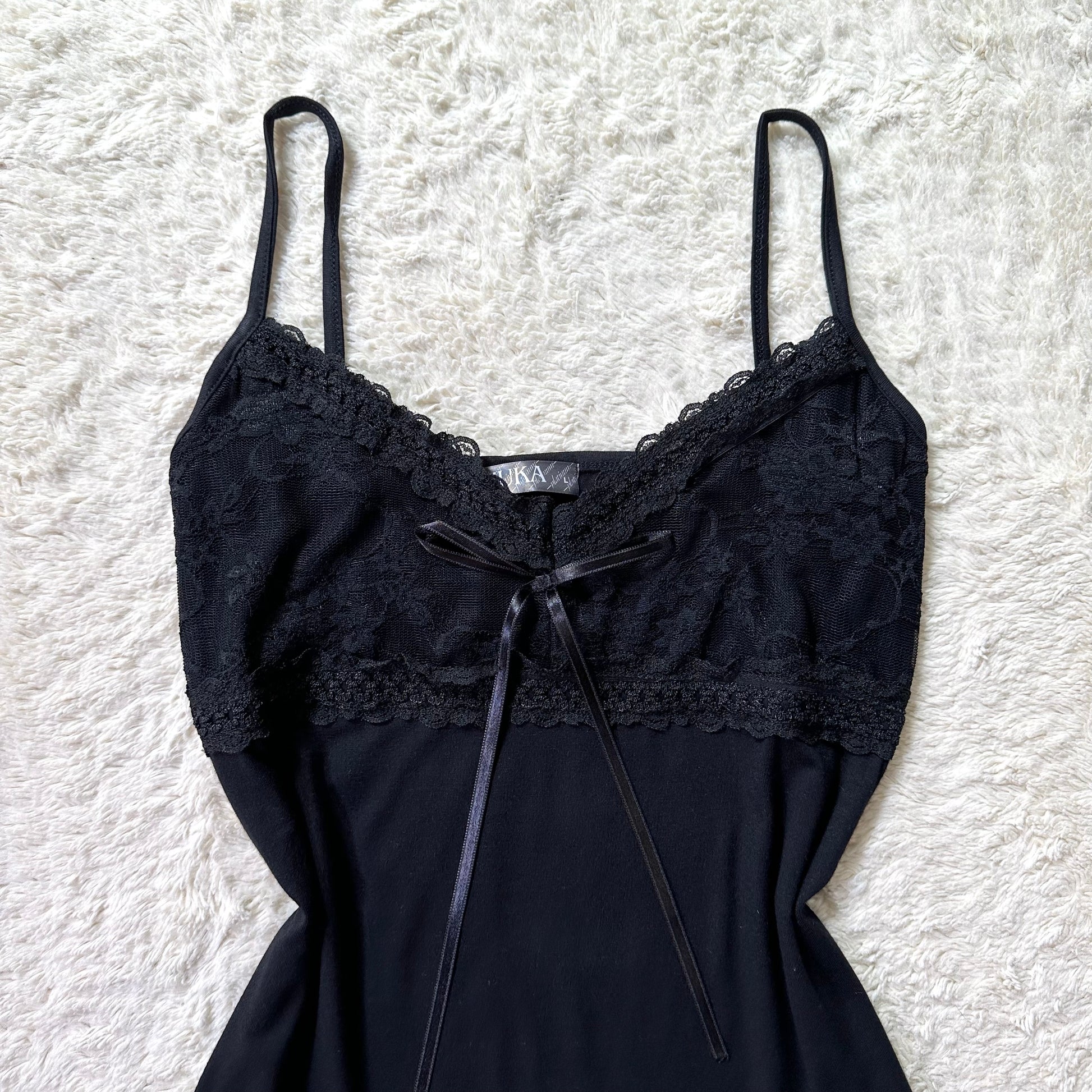 jet black fairy style, soft cotton cami top with floral lace detailing on the bust, ruffle trim, and a satin decorative bow in the center