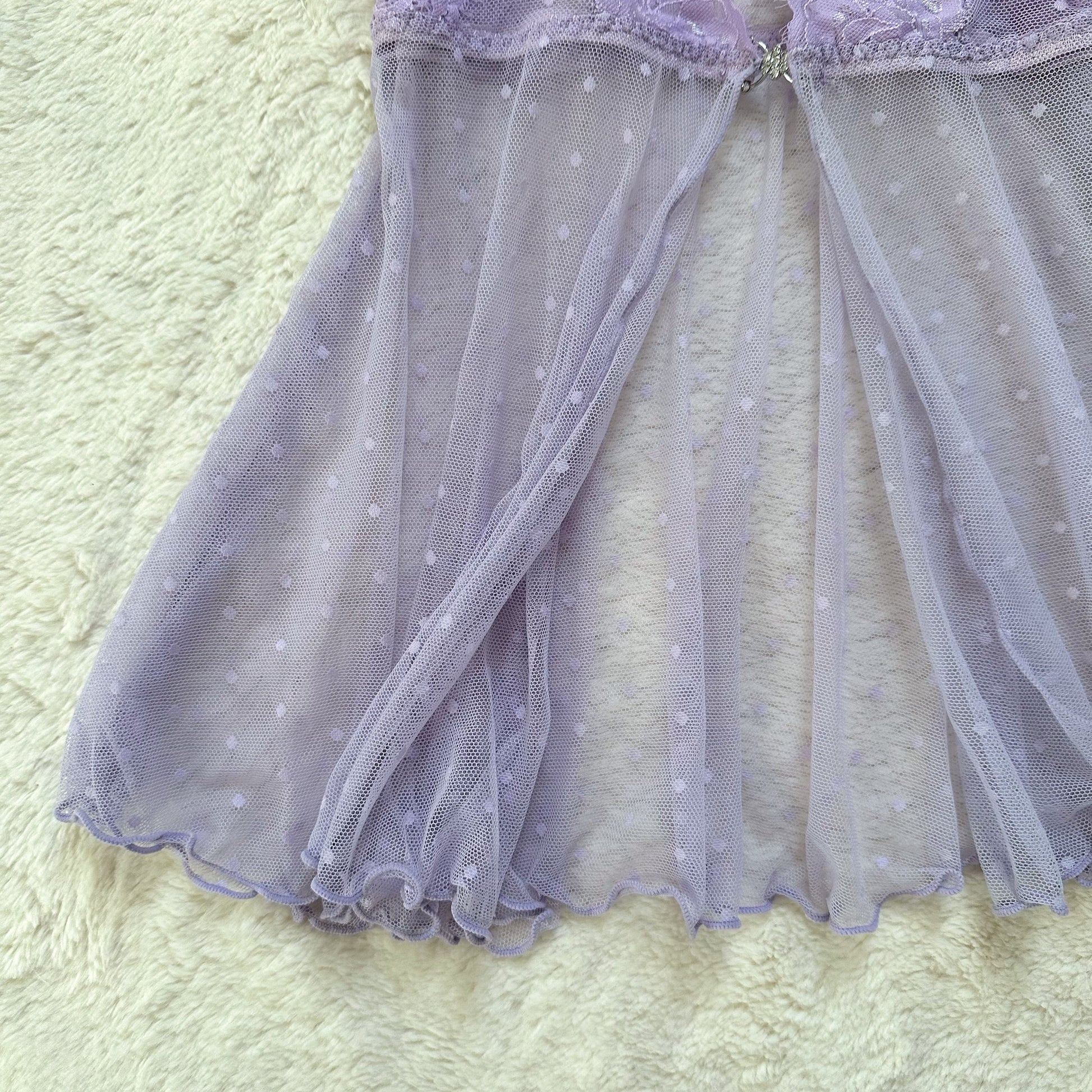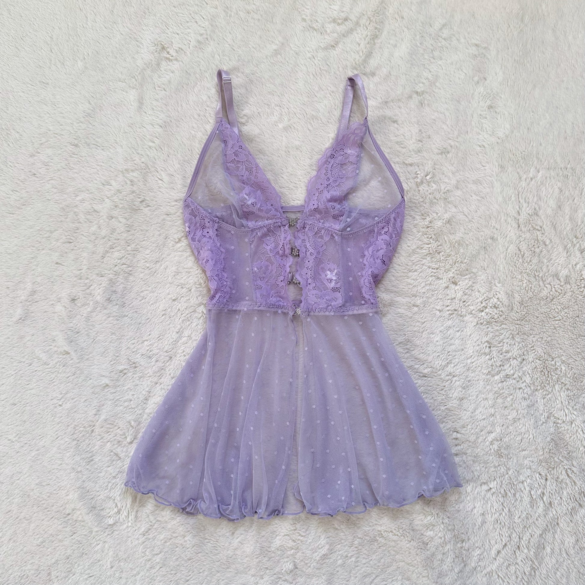 sheer light purple dotted mesh micro slip dress with floral lace detailing, silver diamond flower closures down the center, and a peek-a-boo, flyaway style slit