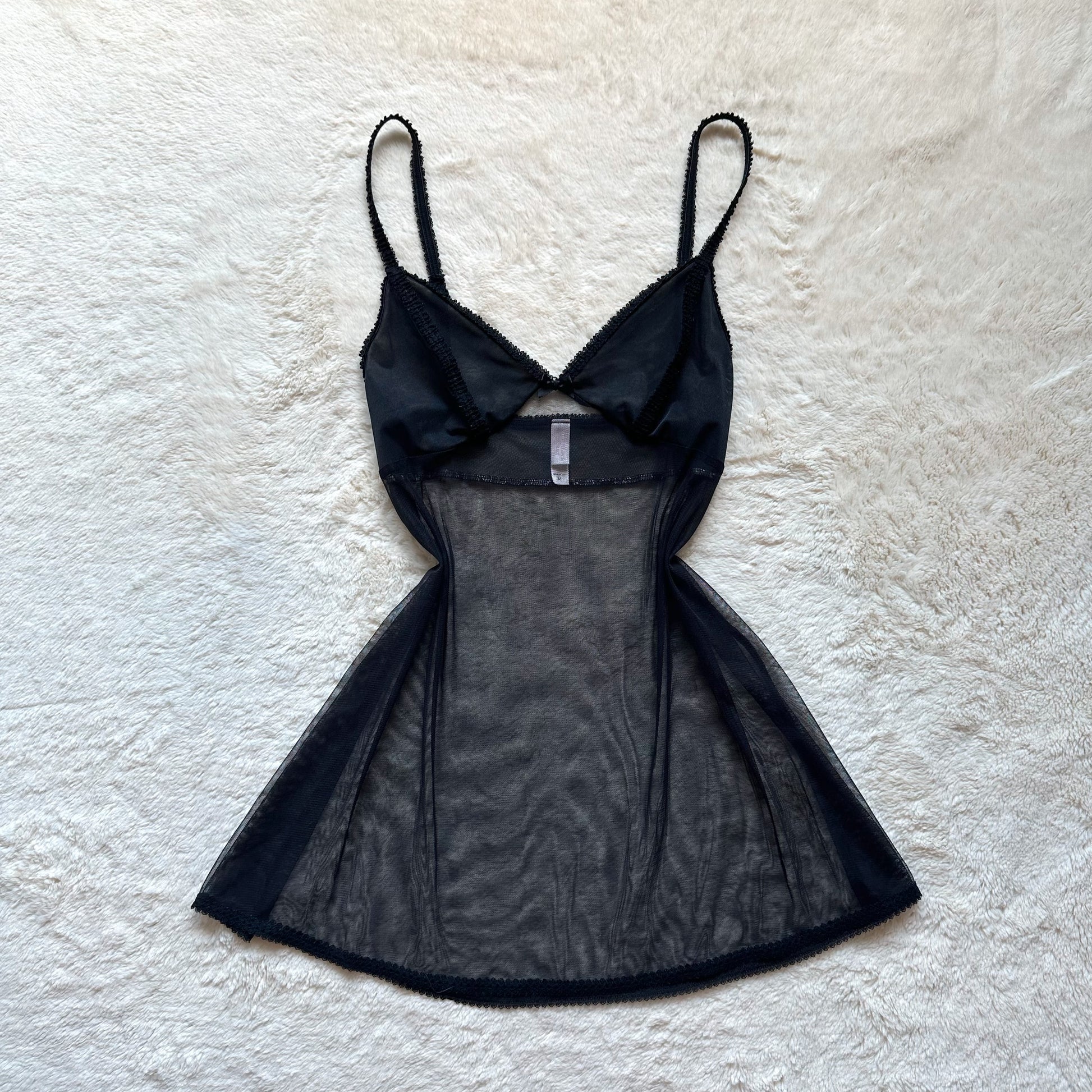 sheer black mesh slip dress with lace accents and a dainty baby bow appliqué in the center, circa march 2002