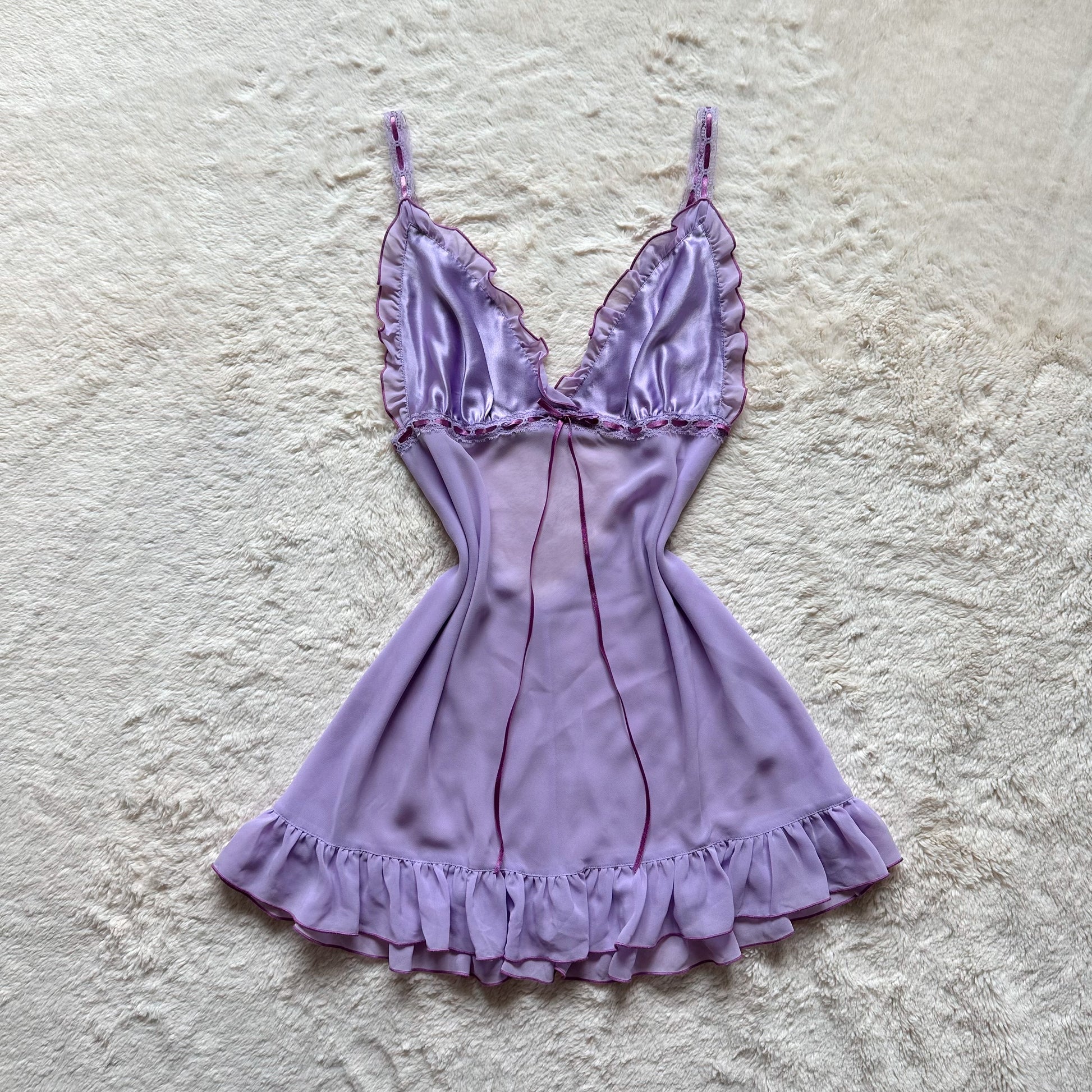 lilac chiffon babydoll slip dress with satin cups, ruffle trim, and lace accent, completed with an open back, circa december 2003