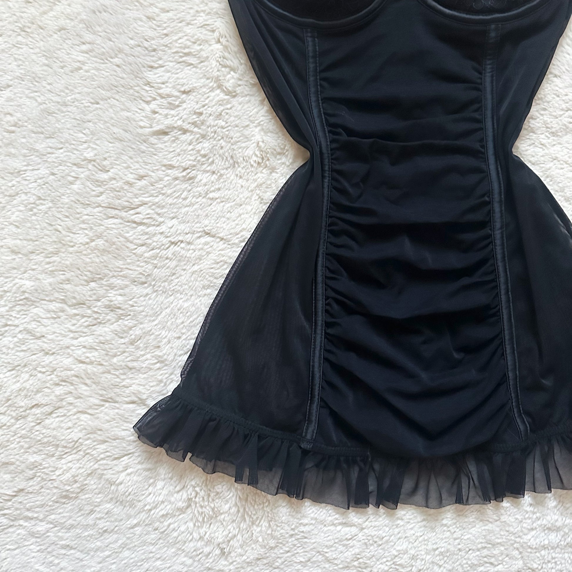 black noir fitted bustier or micro mini slip dress with floral embroidered mesh on the cups, ruching down the center, and open back, completed with adjustable straps, circa july 2009