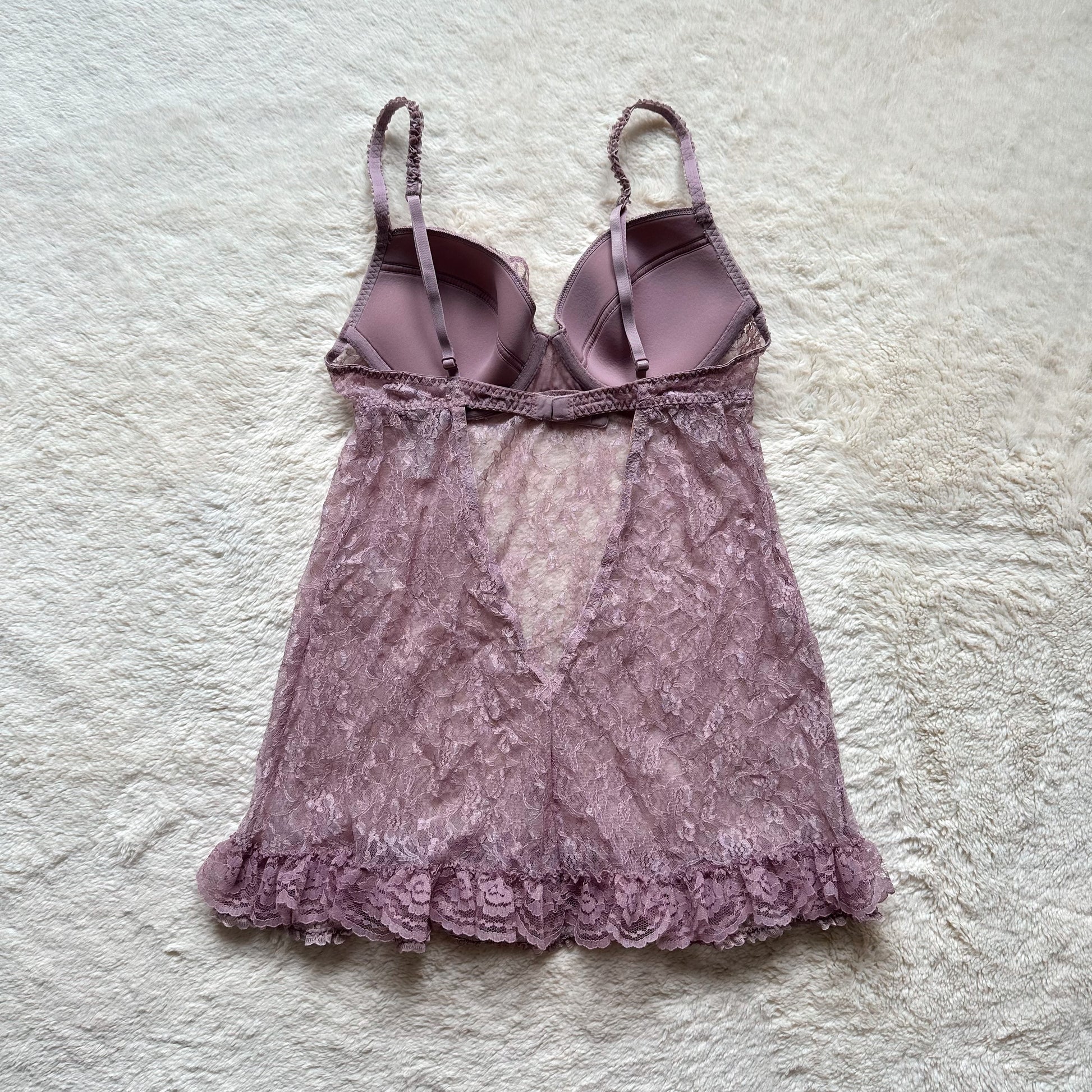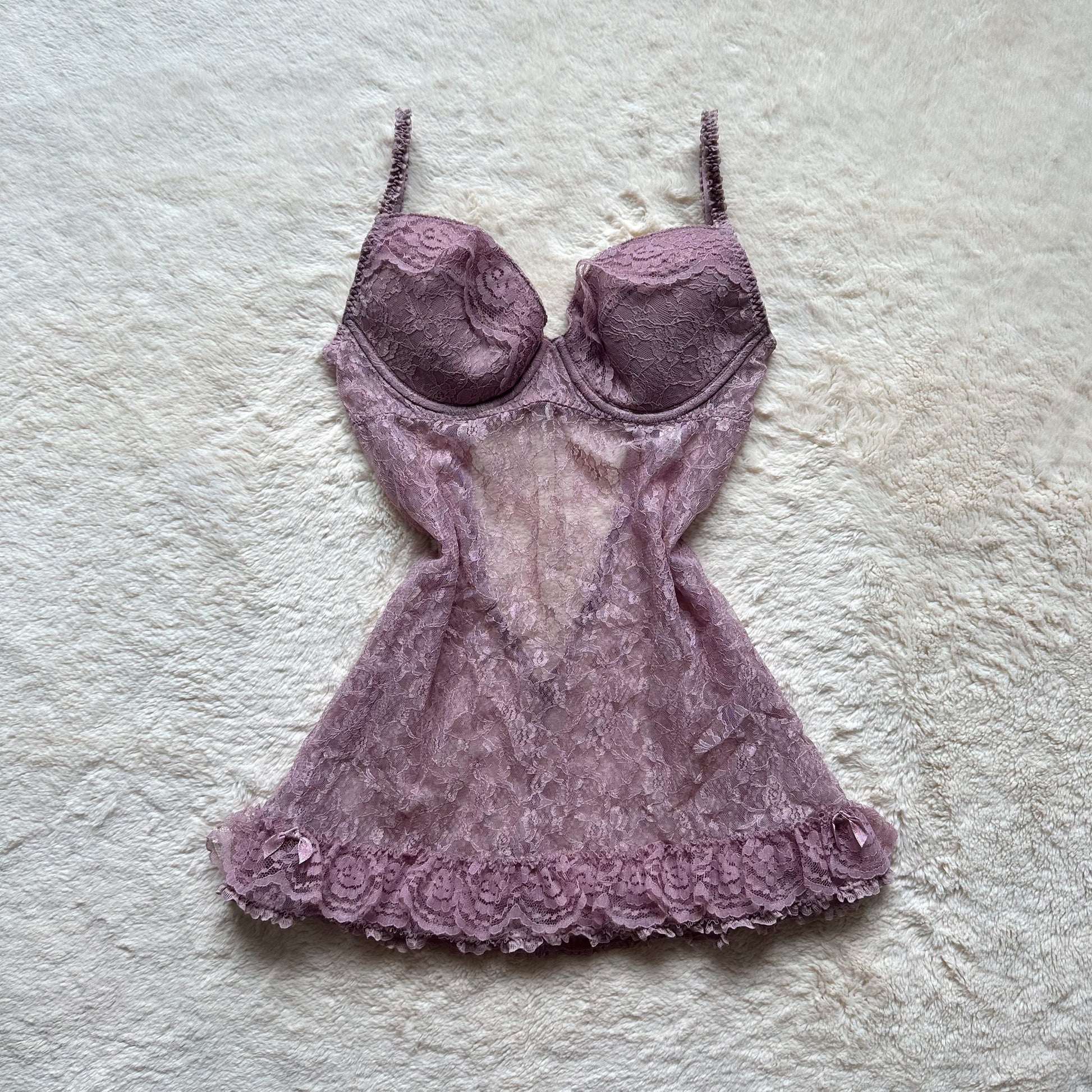 mauve purple floral lace micro mini babydoll slip dress with lined cups, ruffle trim, and baby bow details, completed with an open back, circa february 2009