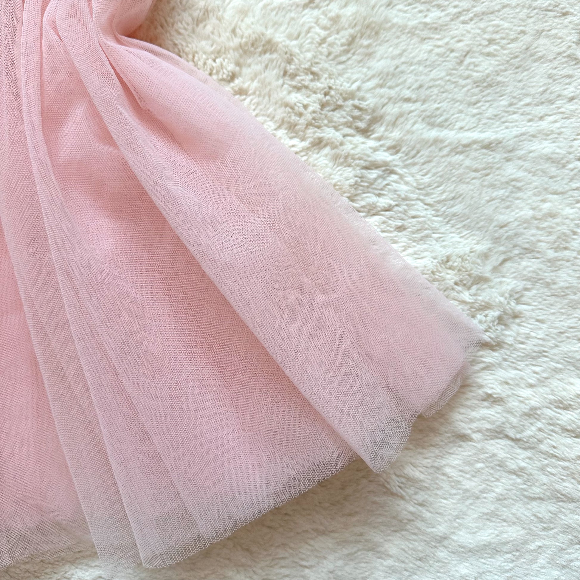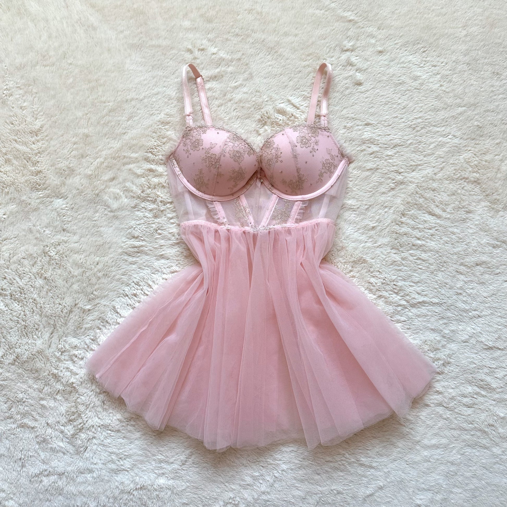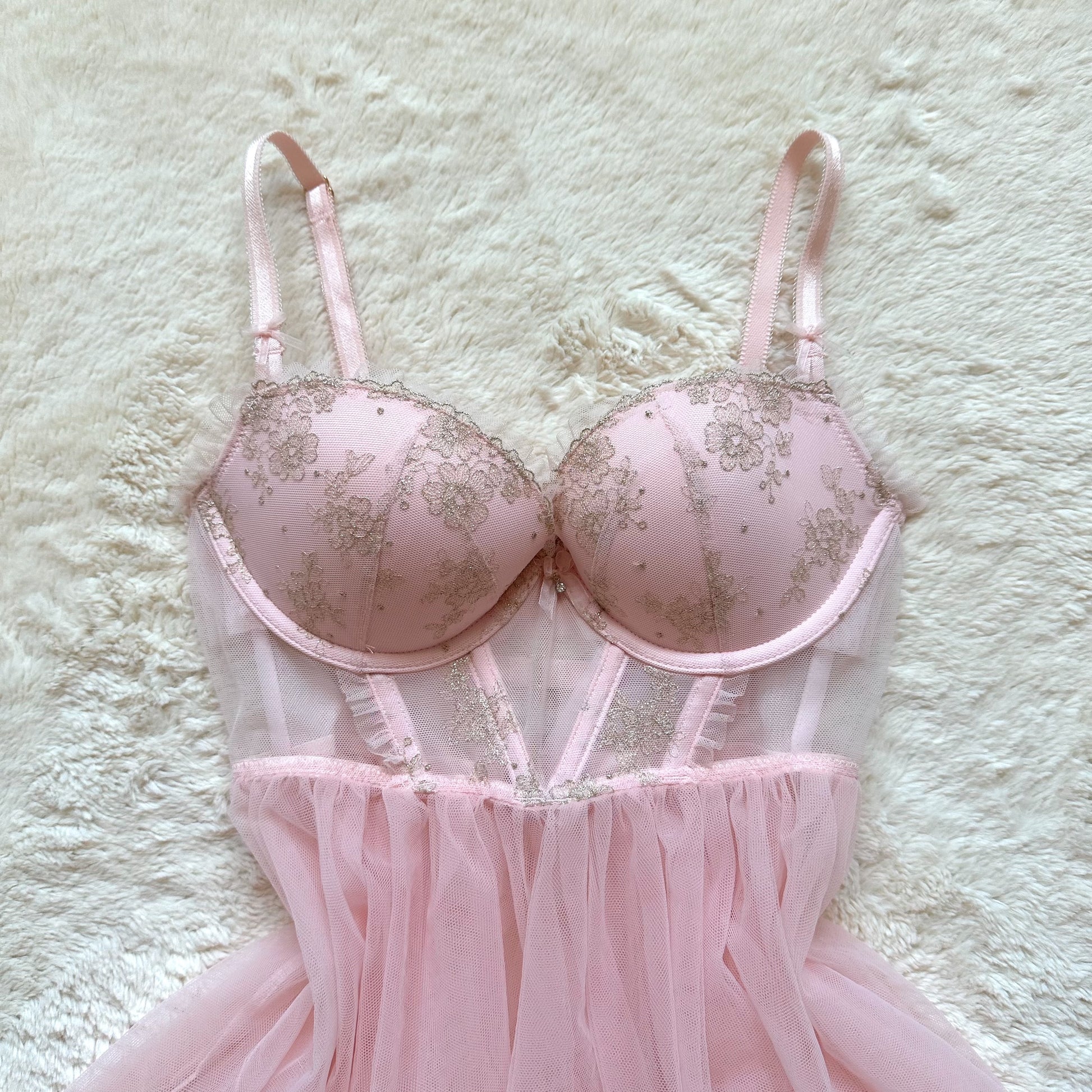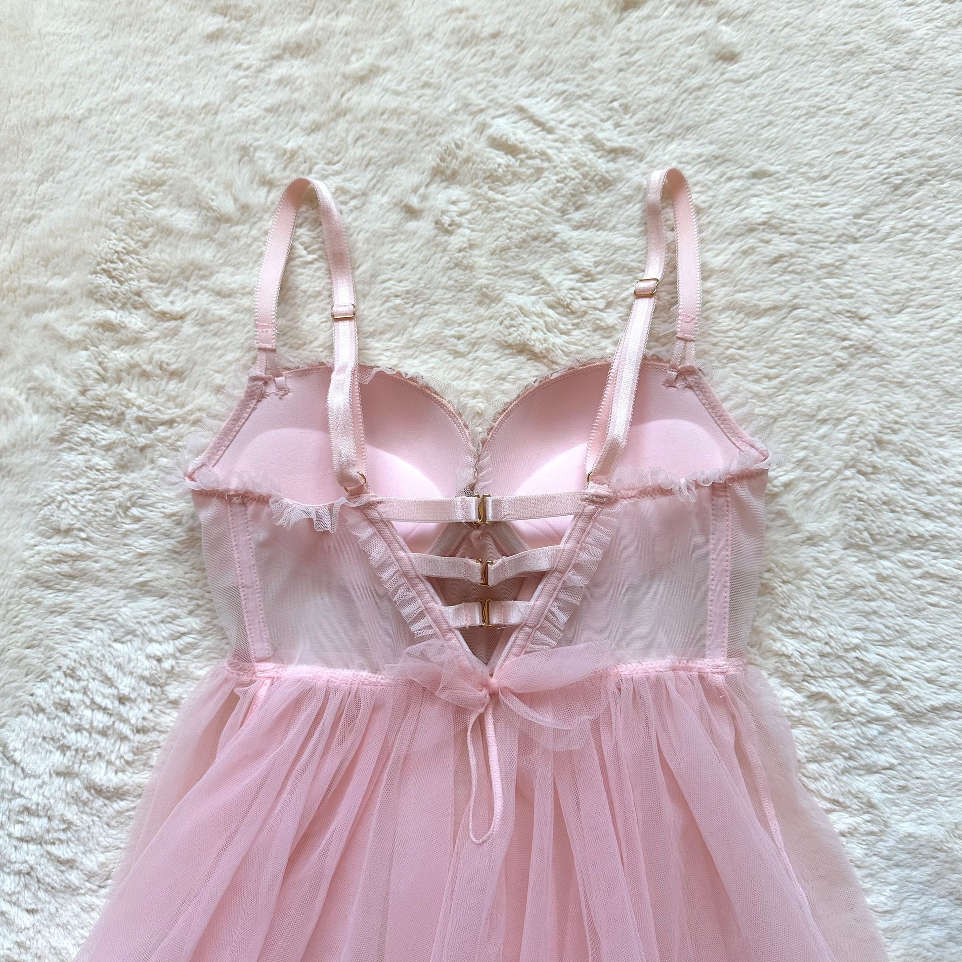 ballerina pink tulle mesh babydoll slip dress with sheer paneling and lined cups, ruffle accents, and shimmery gold floral details, completed with a dangling charm baby bow appliqué in the center, a strappy hook back adorned with a decorative tulle bow, and adjustable straps to fit to your liking, circa july 2014
