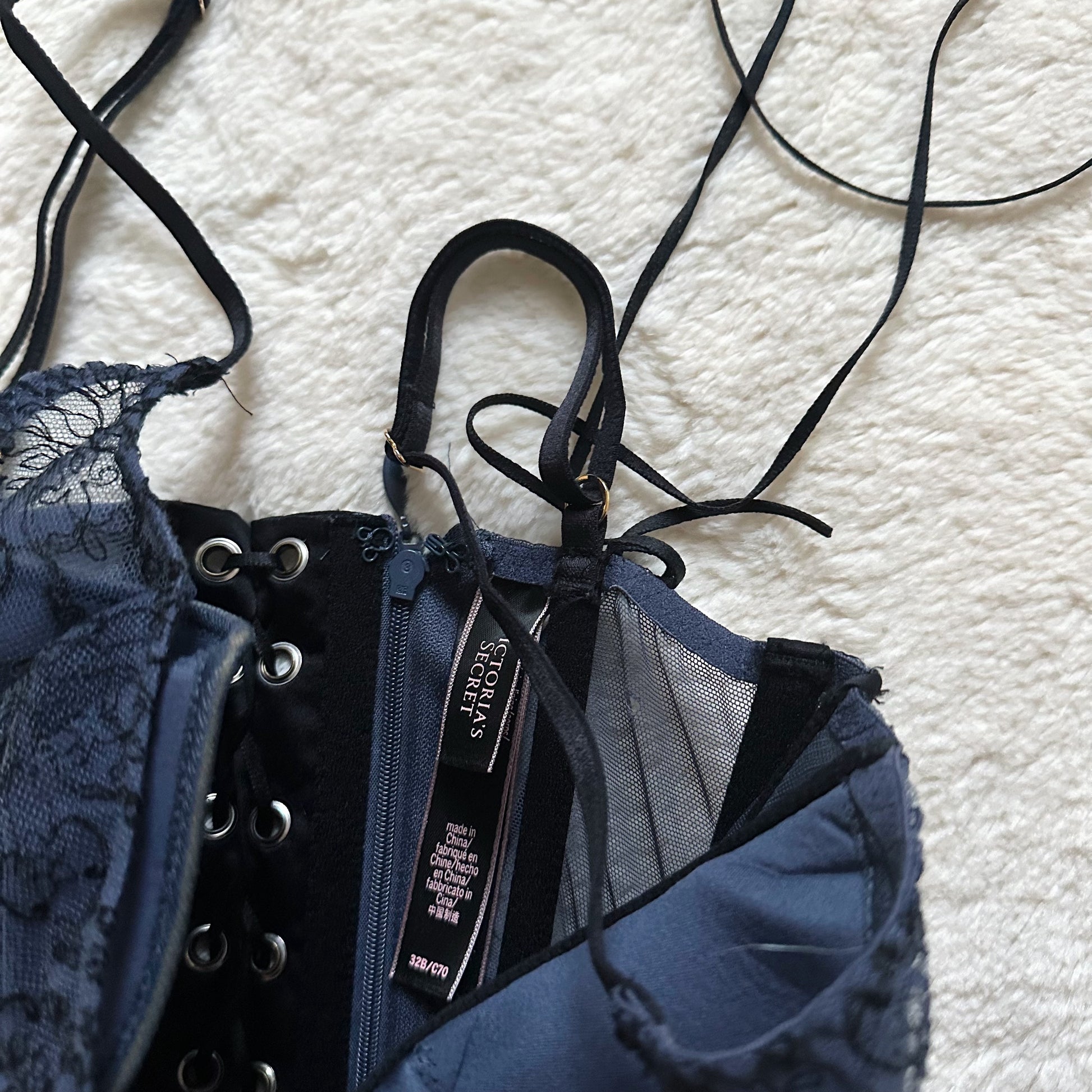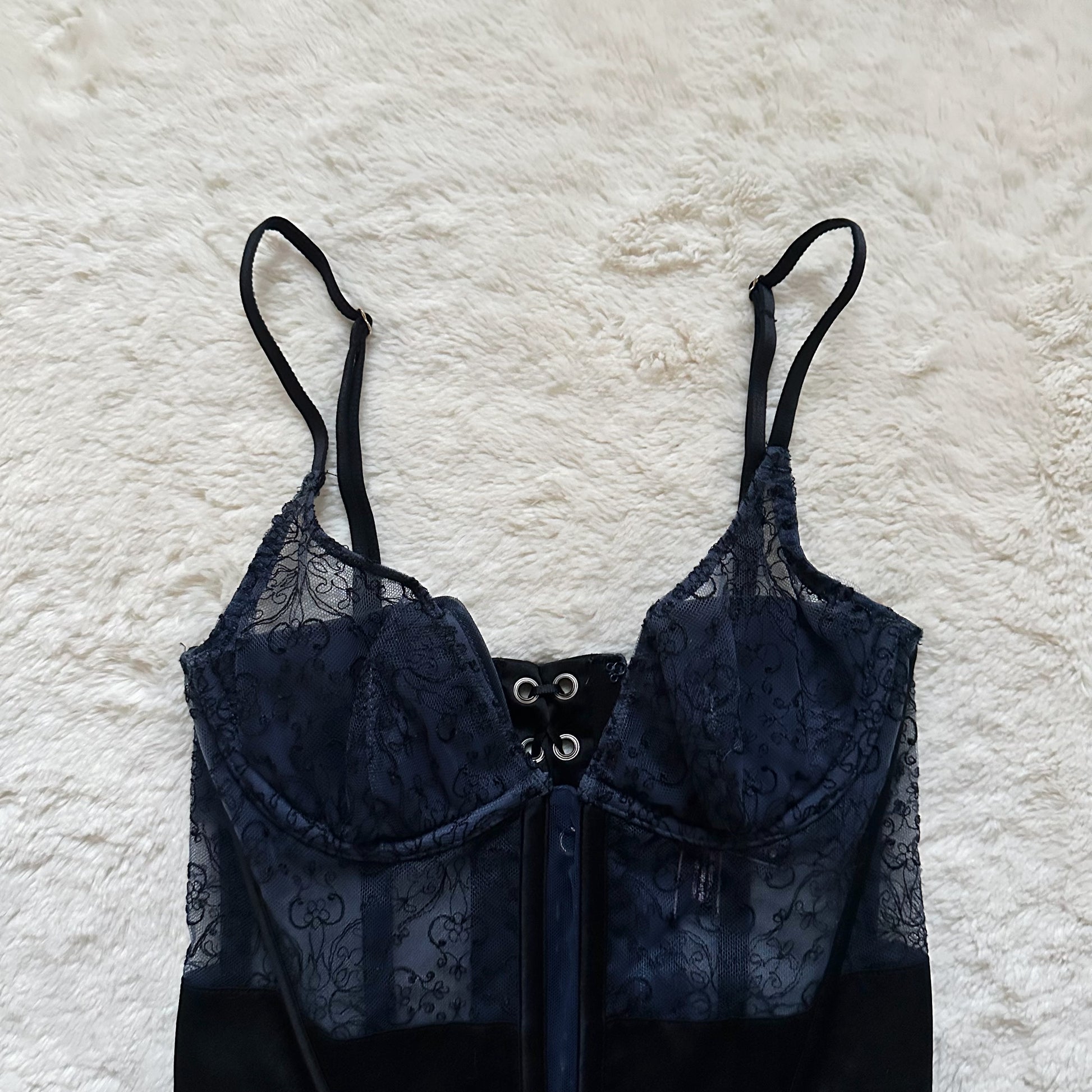 sheer navy blue mesh corset with black floral embroidery, a lace up back, and zipper closure, completed with adjustable straps to fit to your liking, circa october 2017