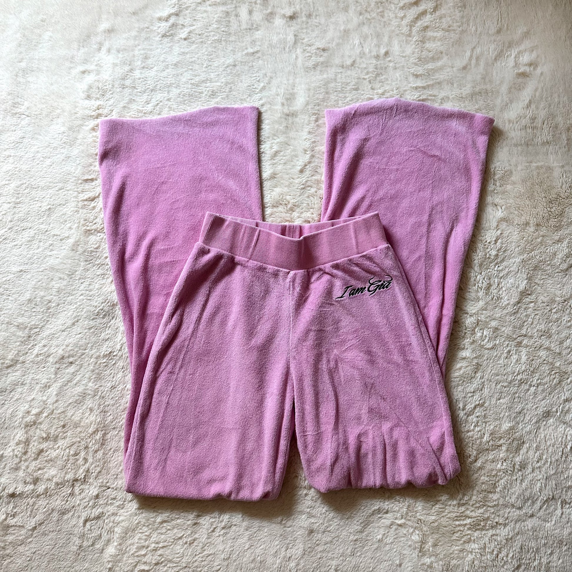 bubblegum pink terrycloth pants with ribbed finishings at the waistline and "I am Gia" printed at one side in black lettering - fits 20-24" waist, 30" inseam