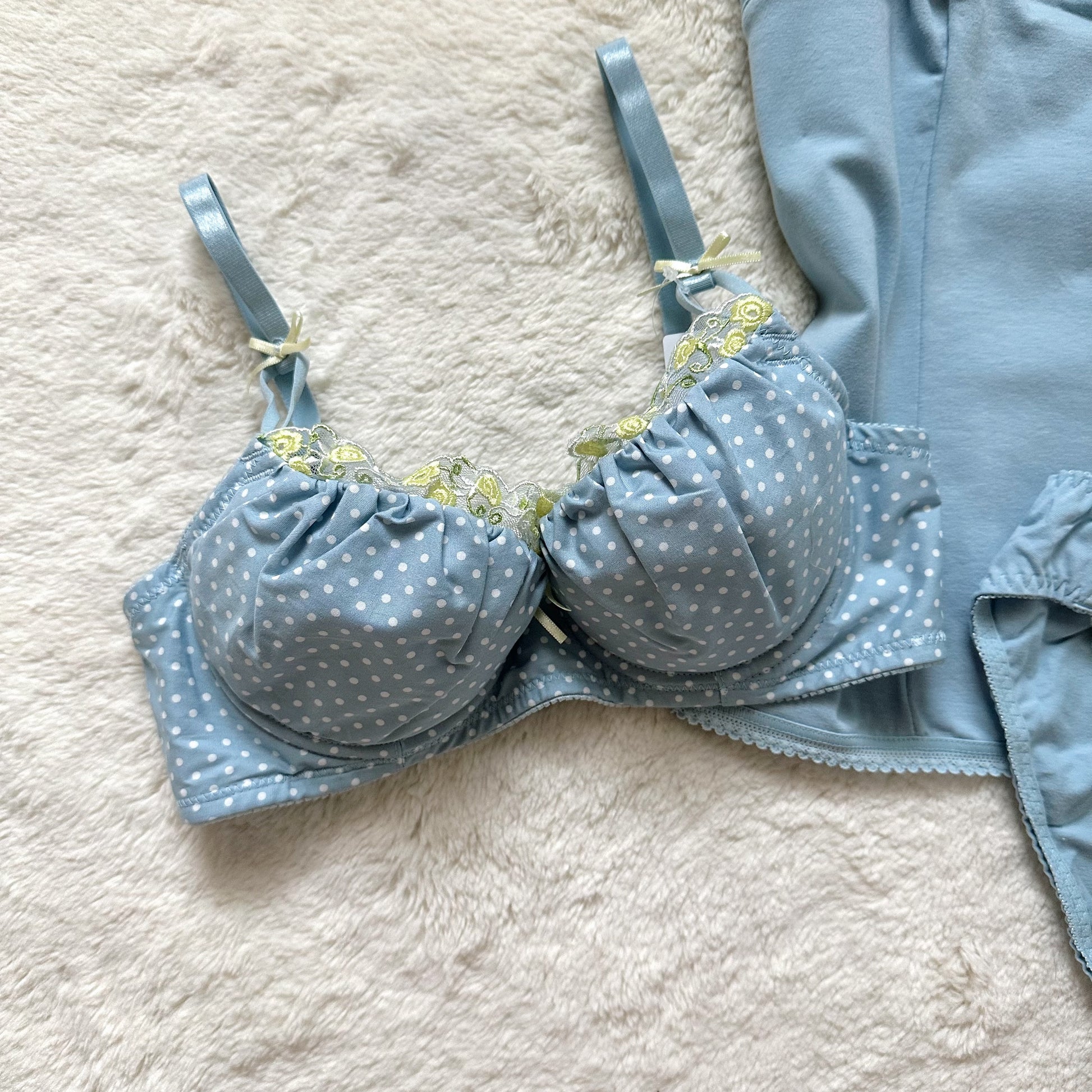 choose your favorite set to style - a sky blue camisole with white polka dots, yellow rose embroidery along the neckline, and dainty baby bow appliqués at each strap, or a matching bra in the same design, either to be paired with coordinating panties