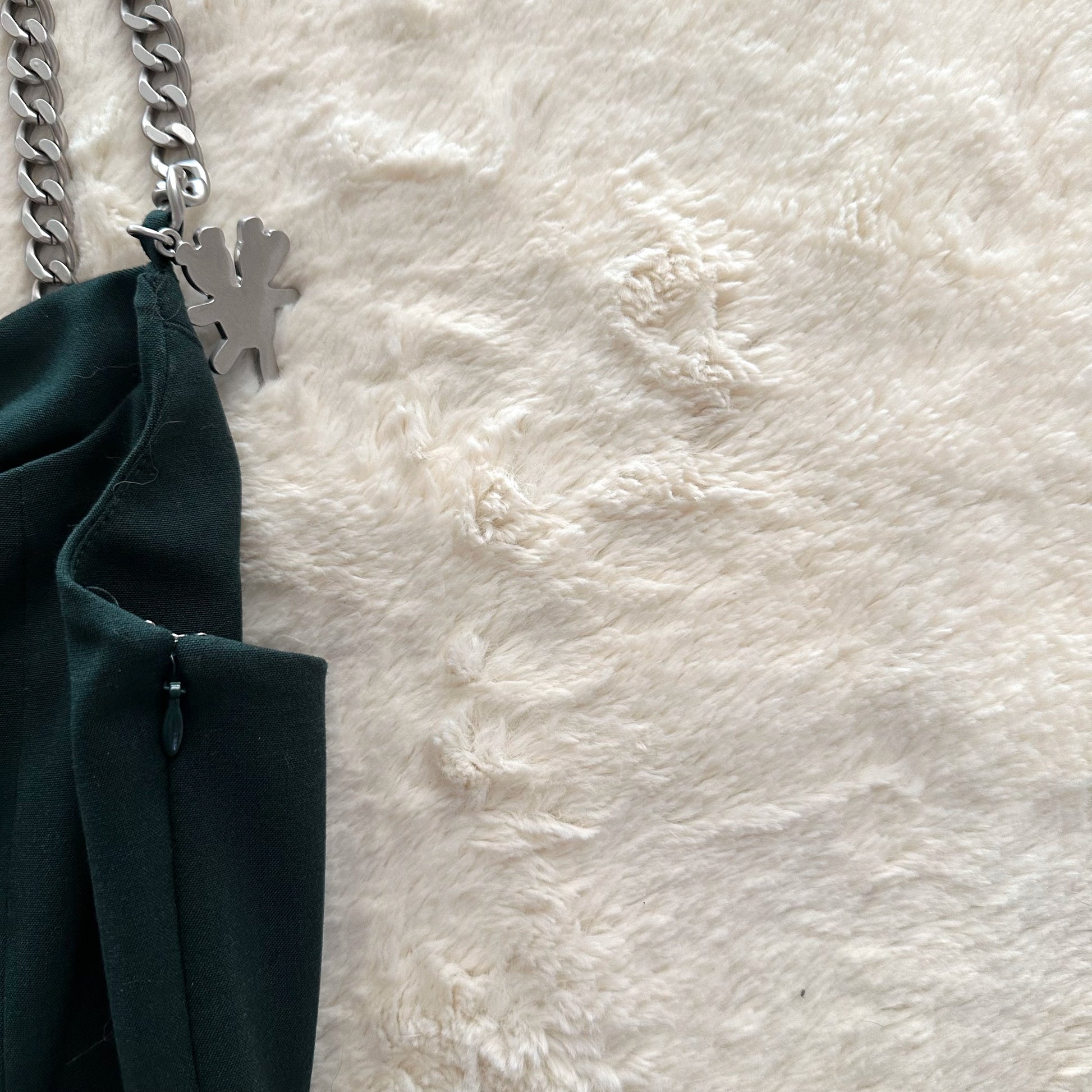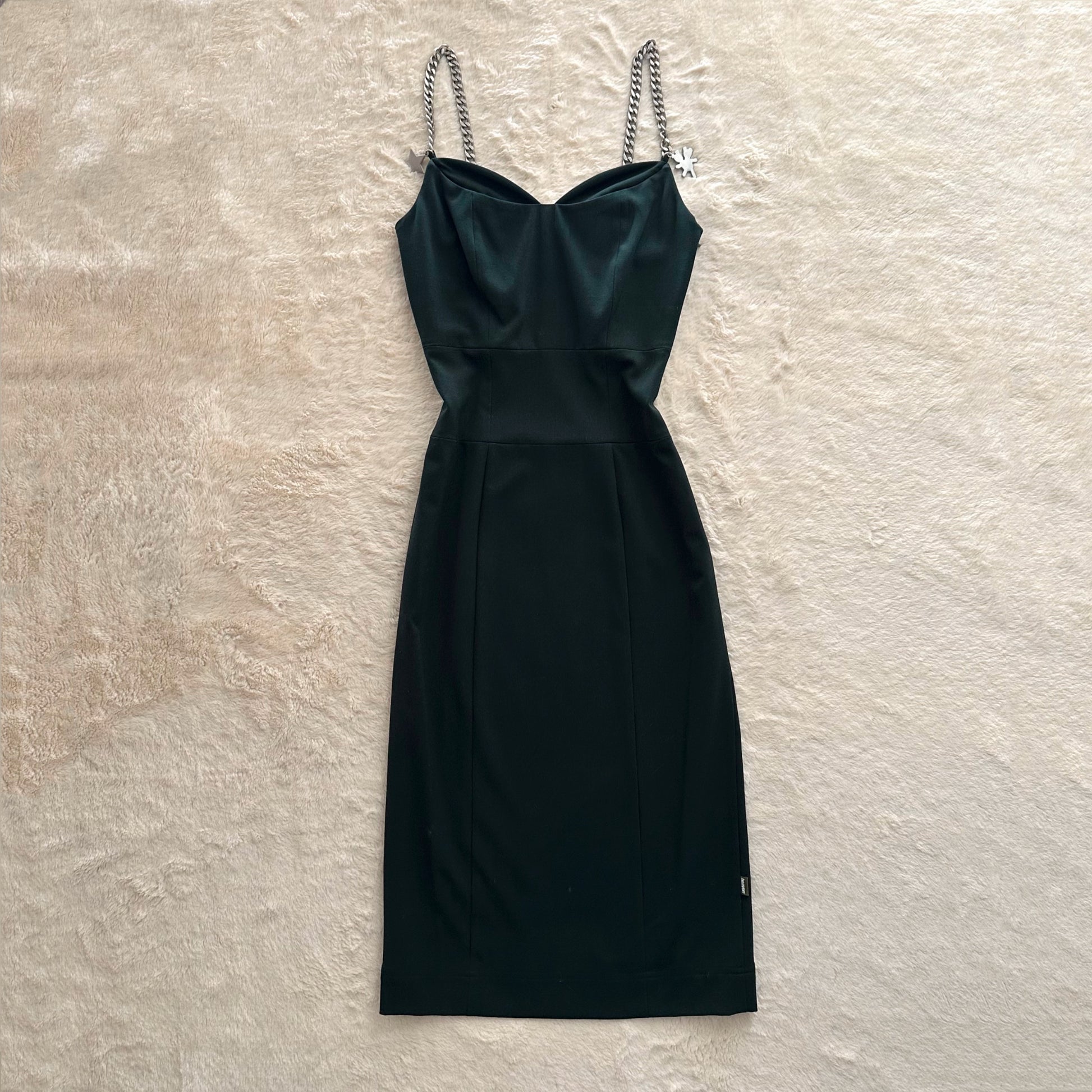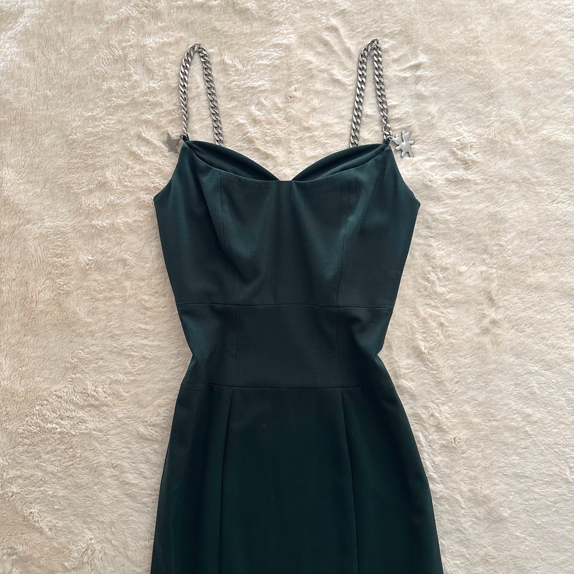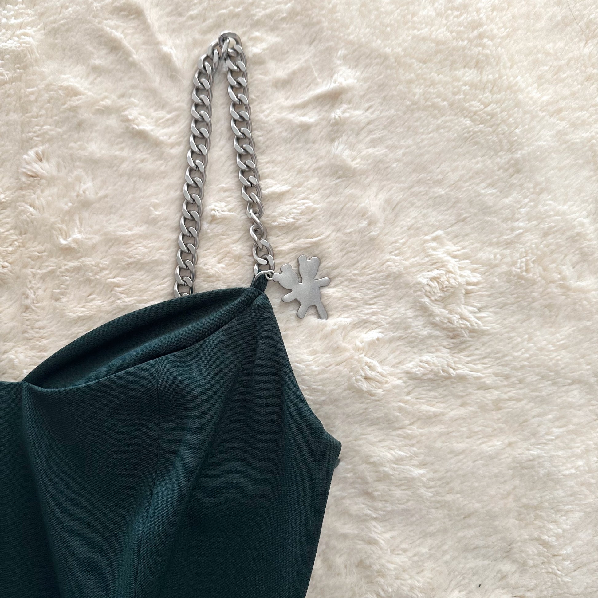 deep forest green midi dress with a sweetheart neckline, chain straps, and a star charm at one side, double-headed teddy at the other, completed with a hidden zipper closure and slit in the back