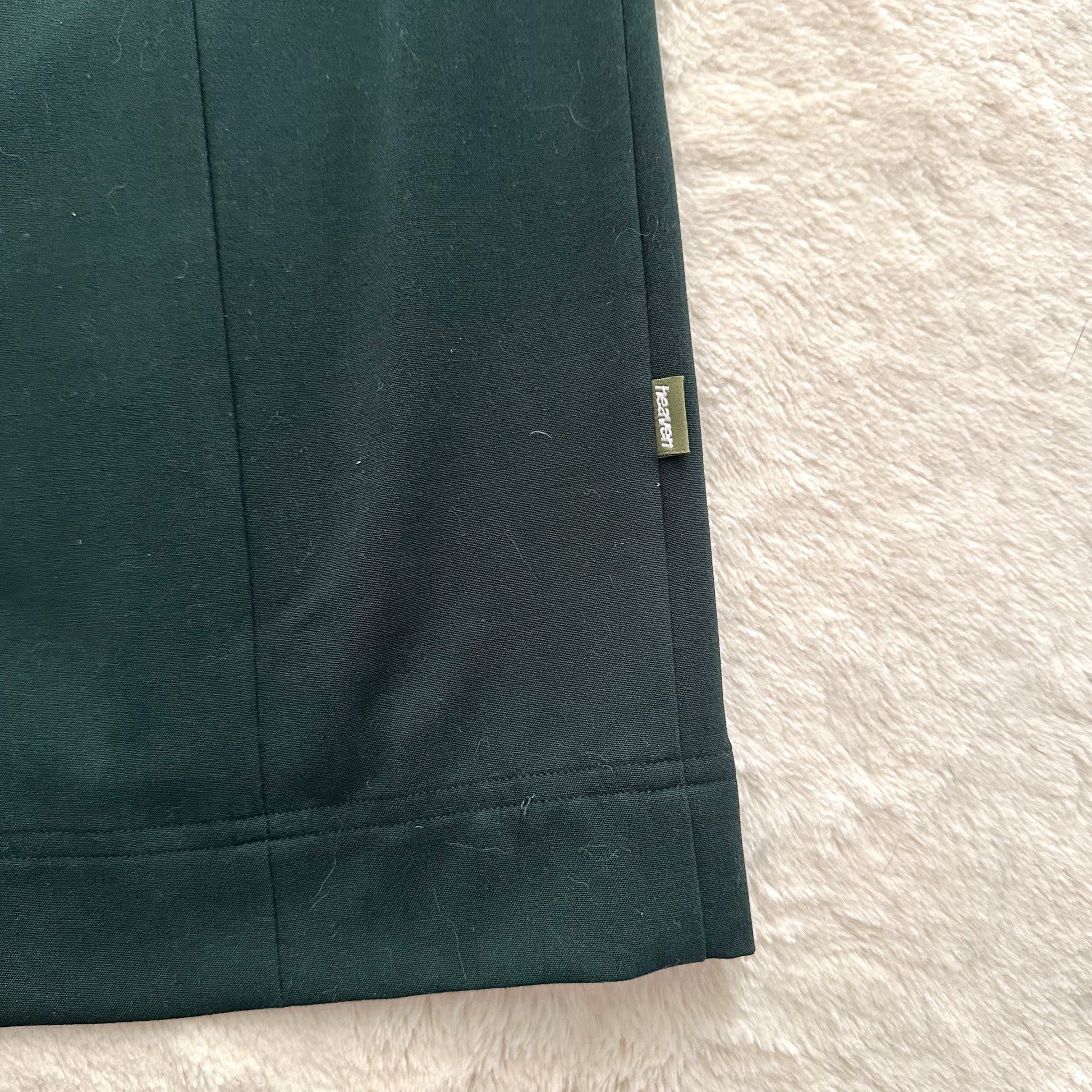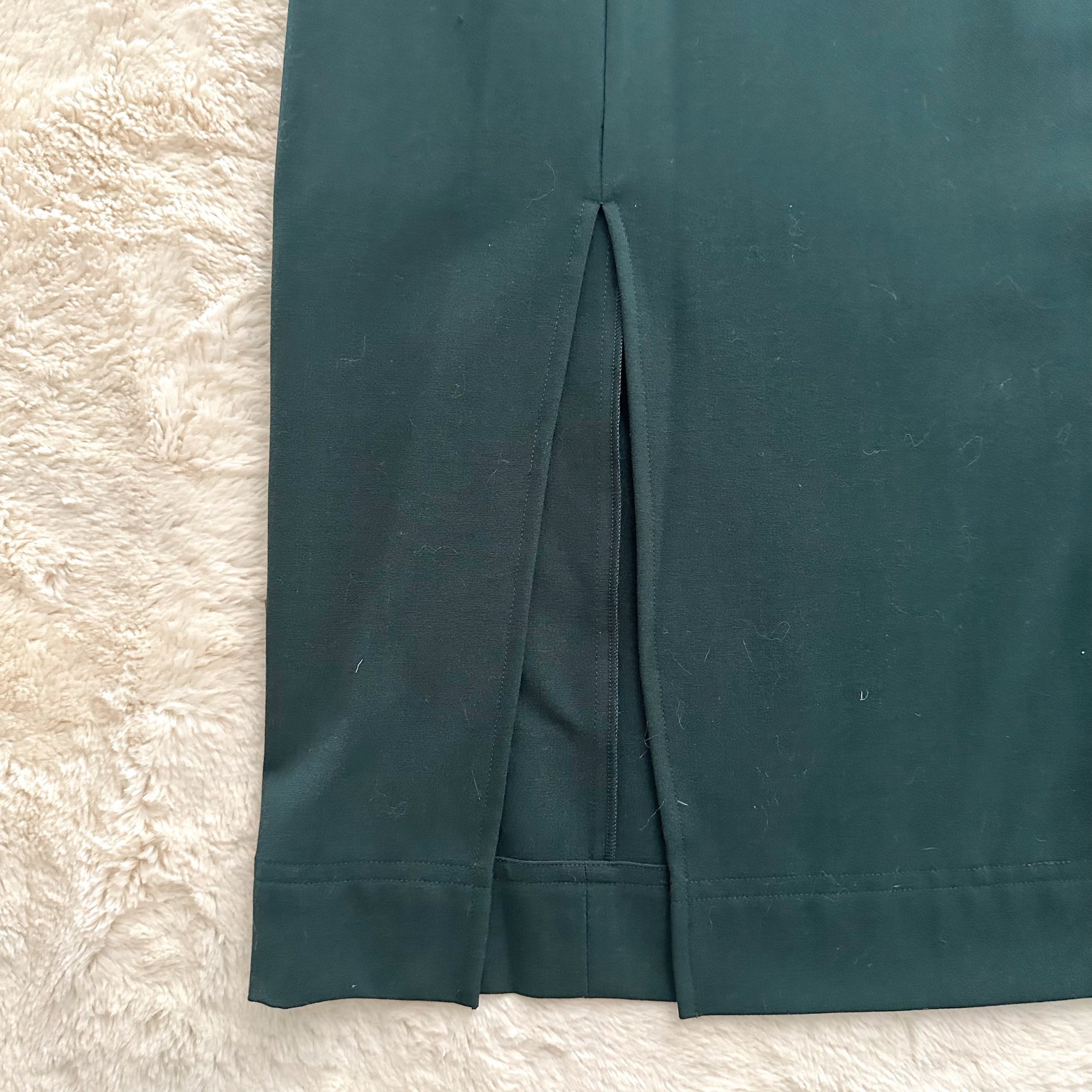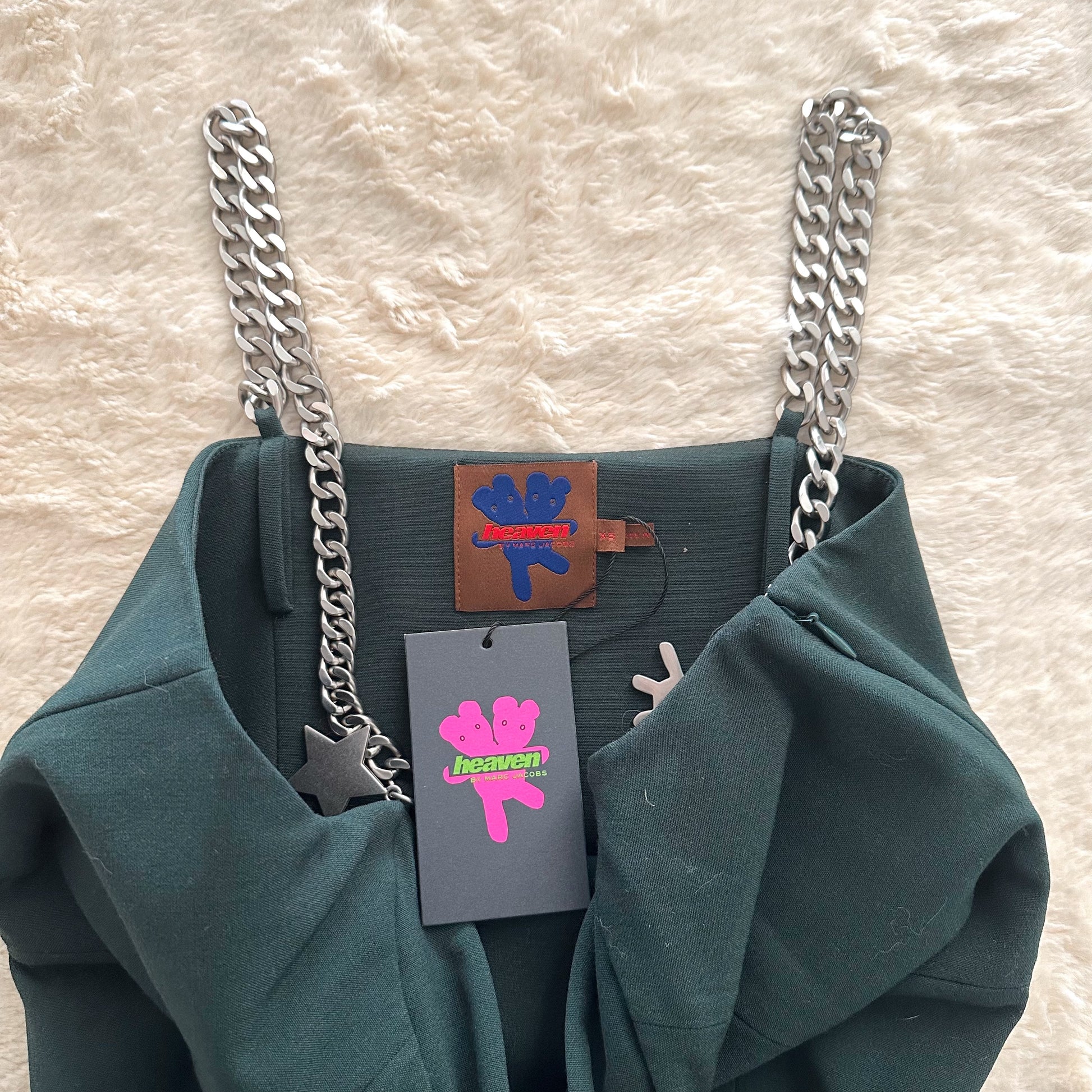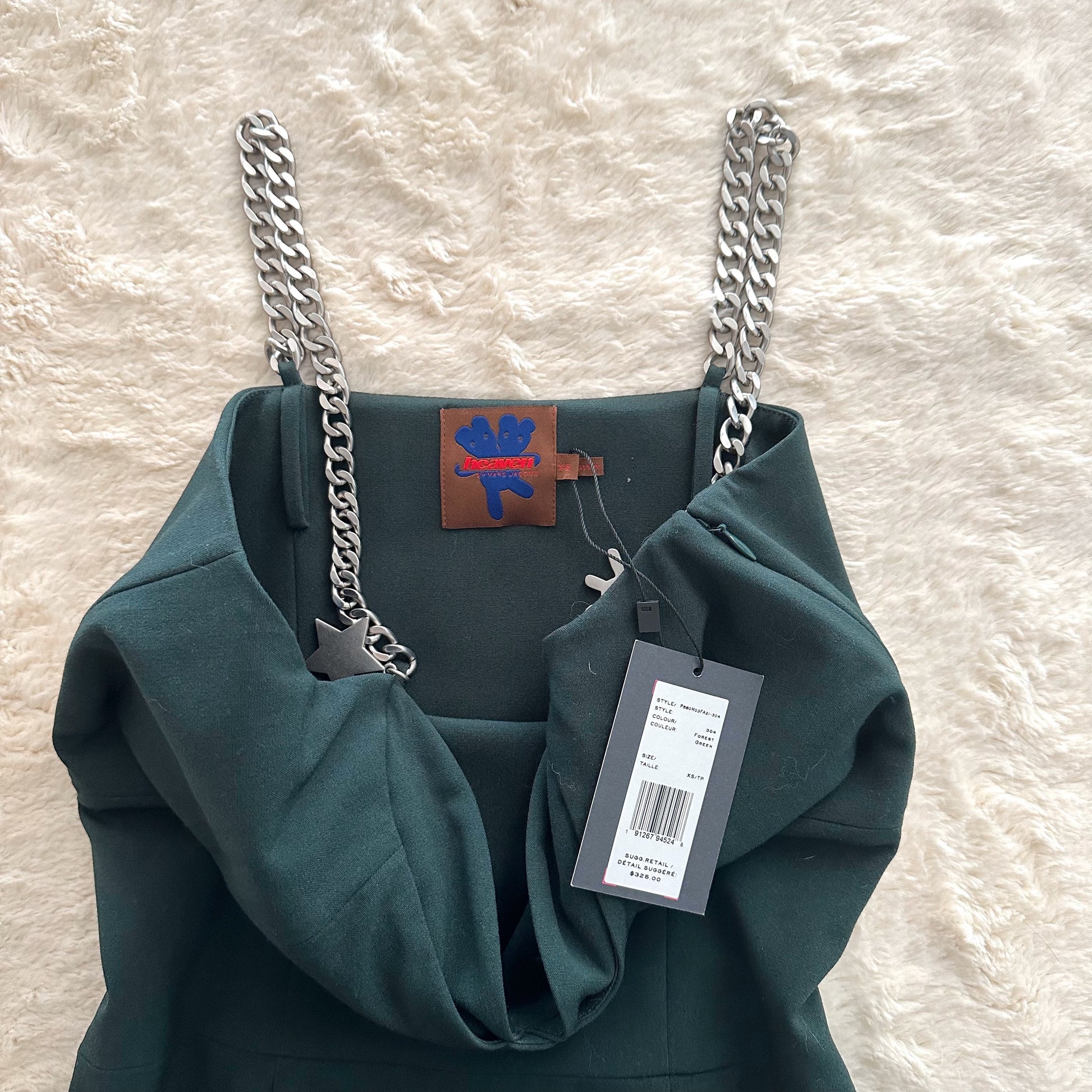 deep forest green midi dress with a sweetheart neckline, chain straps, and a star charm at one side, double-headed teddy at the other, completed with a hidden zipper closure and slit in the back