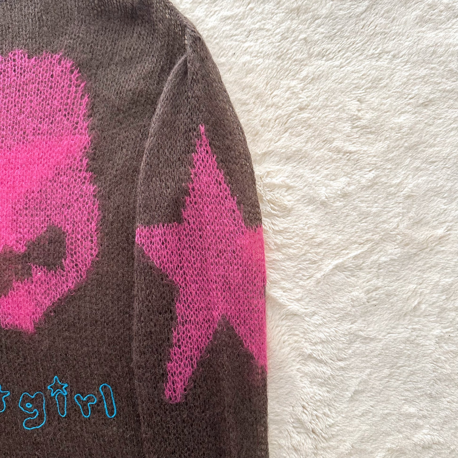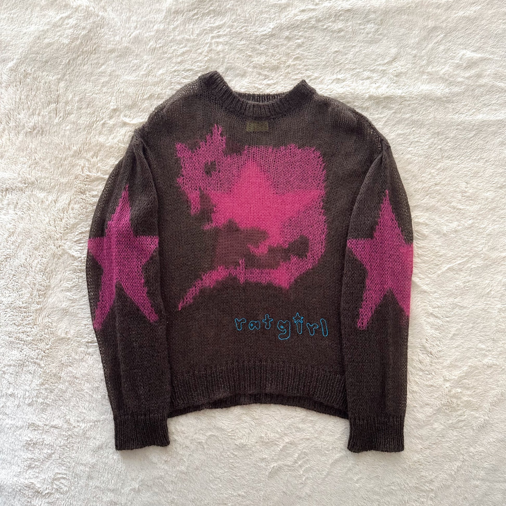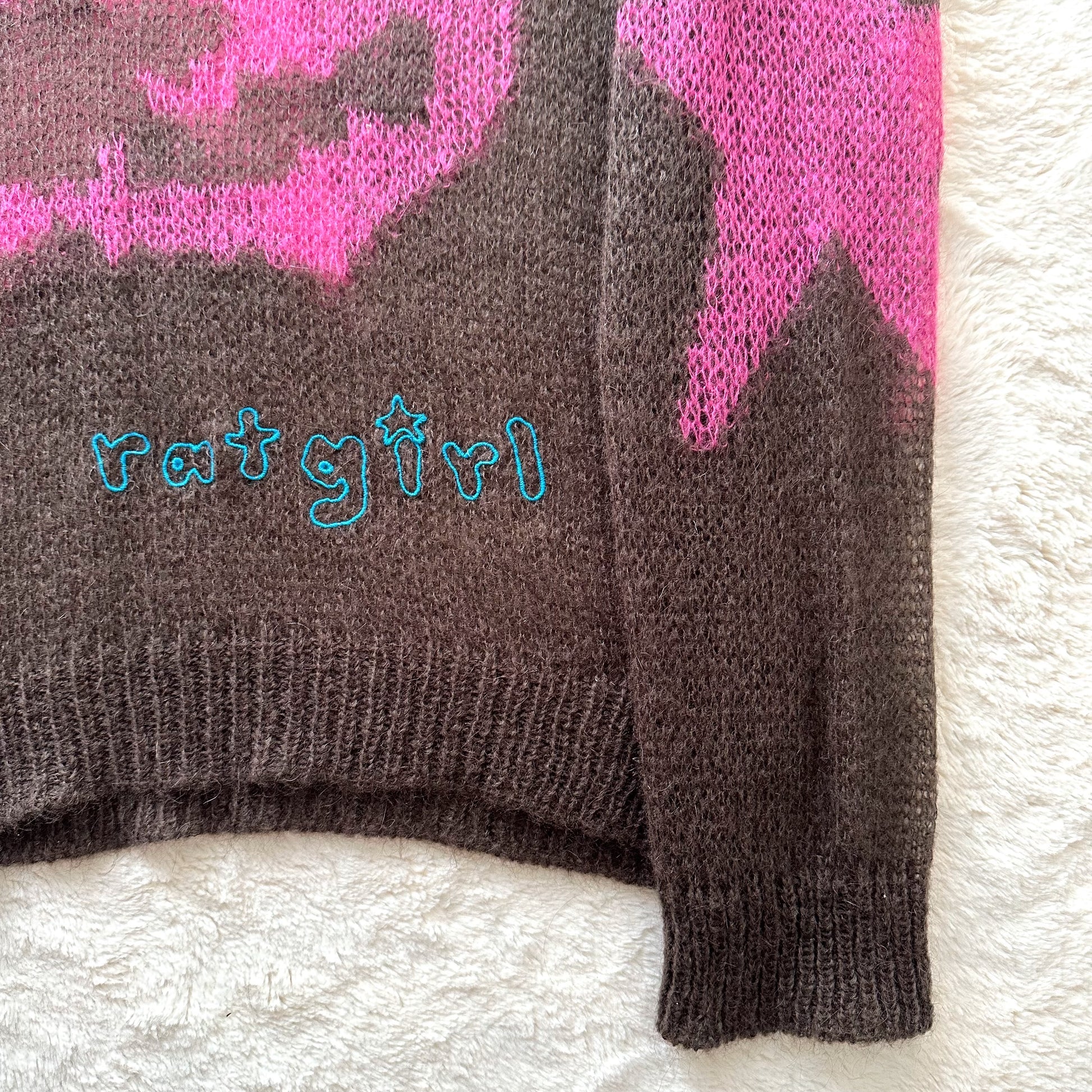 brown mohair sweater with a pink rat graphic, stars on either sleeve, and "ratgirl" in blue bubble lettering