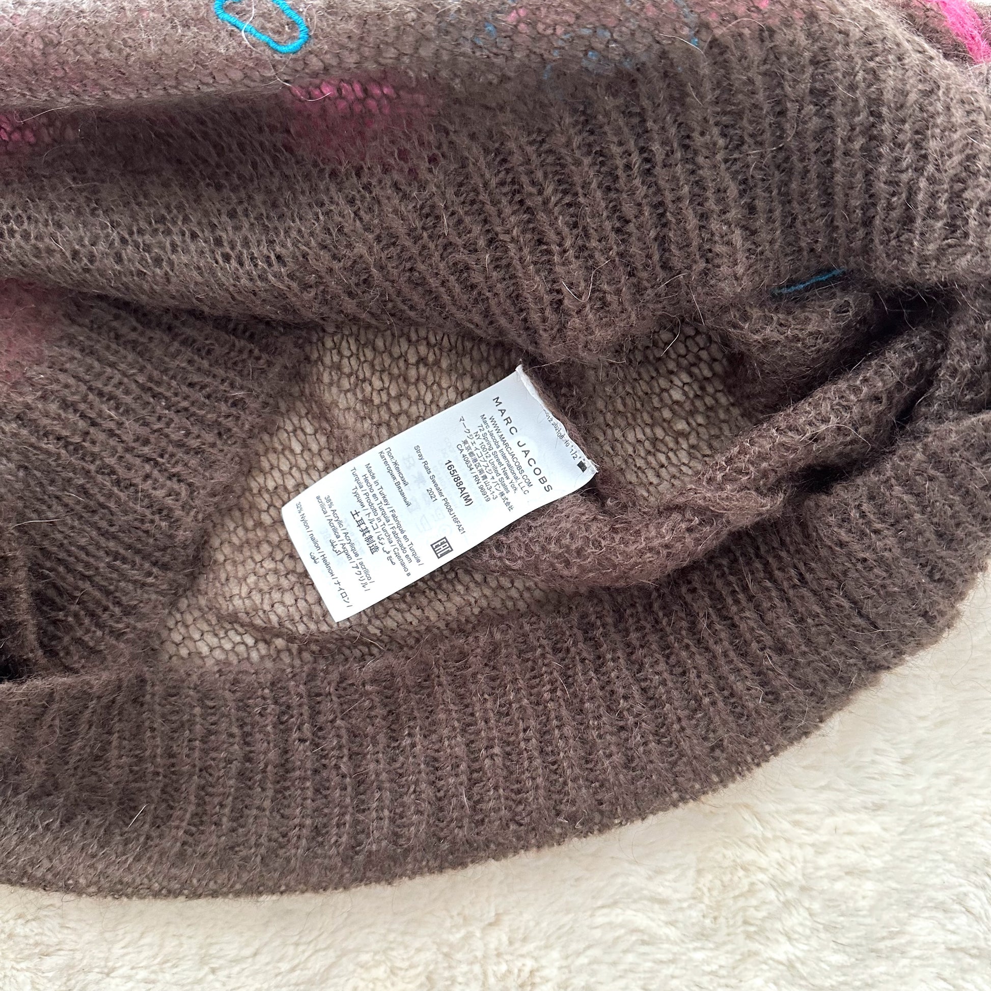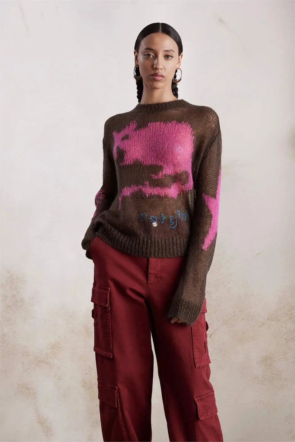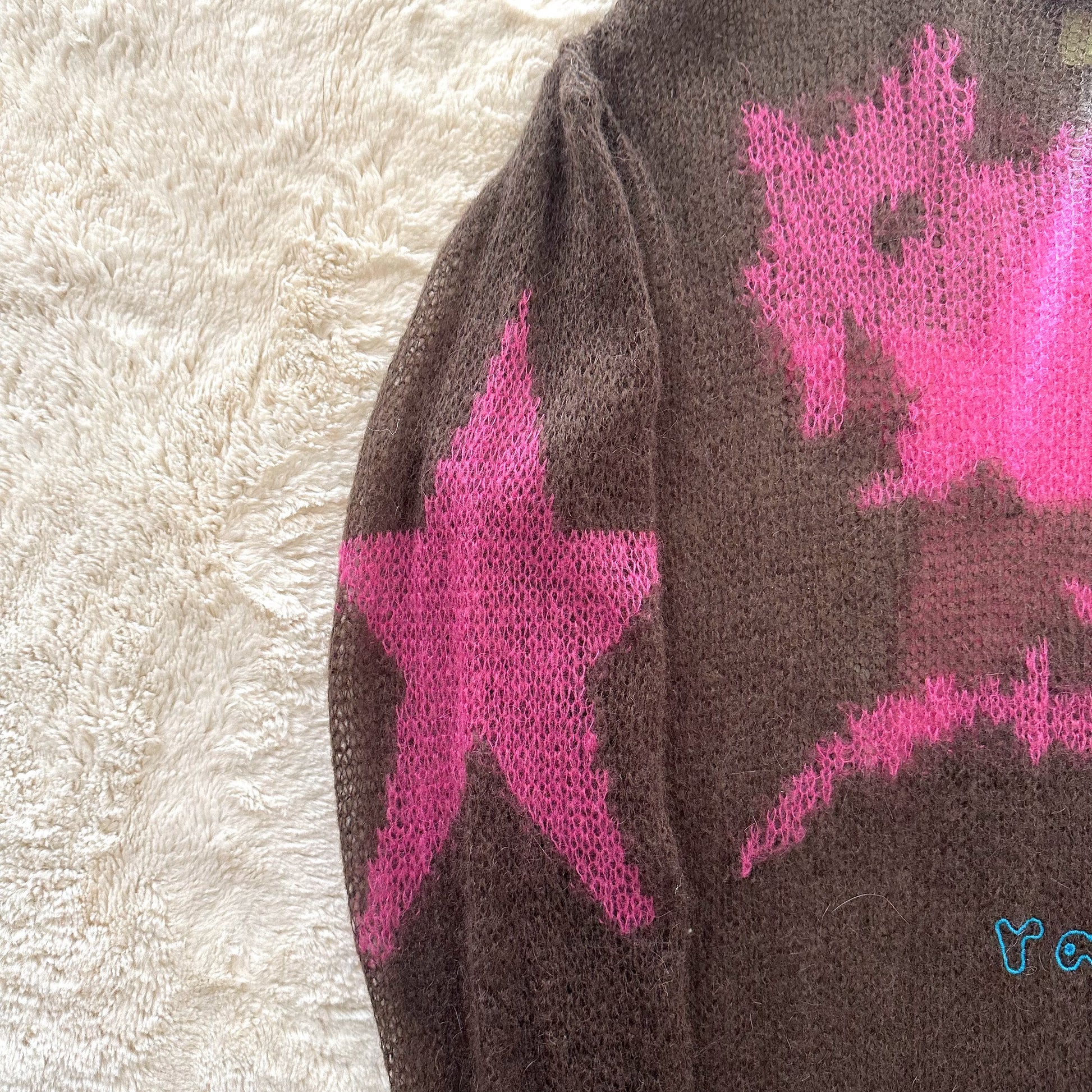brown mohair sweater with a pink rat graphic, stars on either sleeve, and "ratgirl" in blue bubble lettering