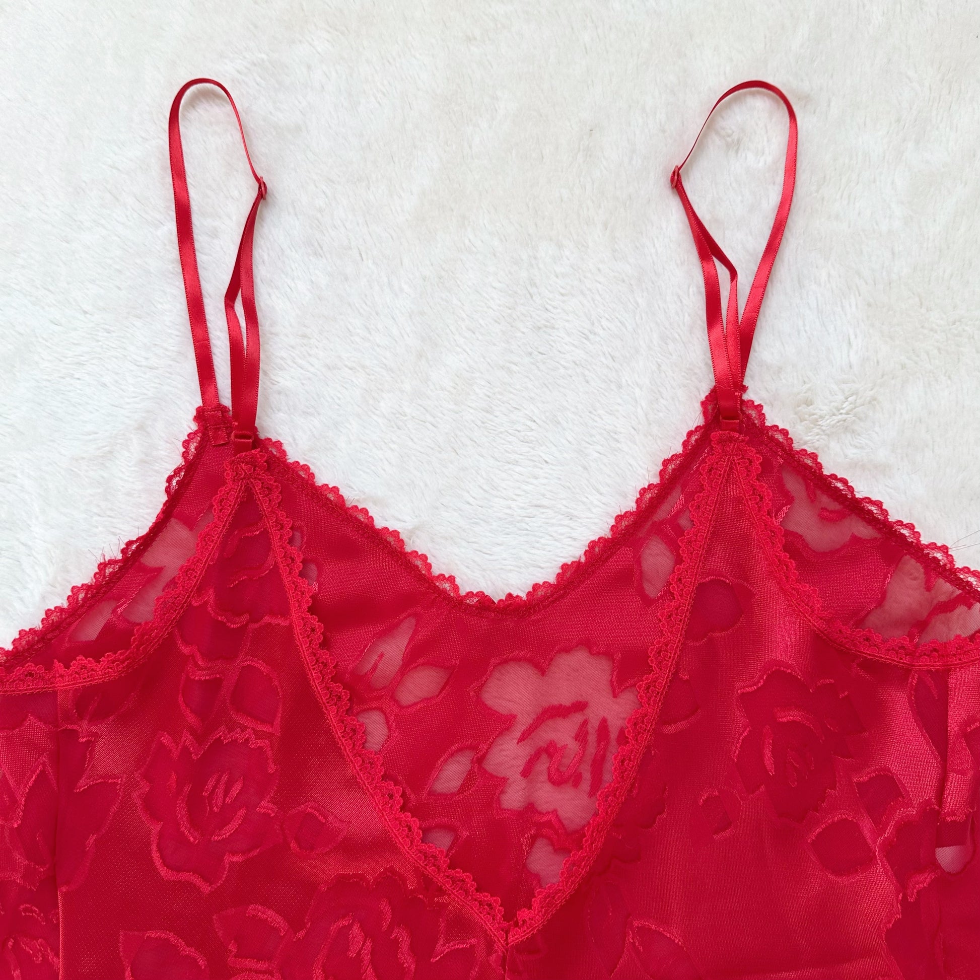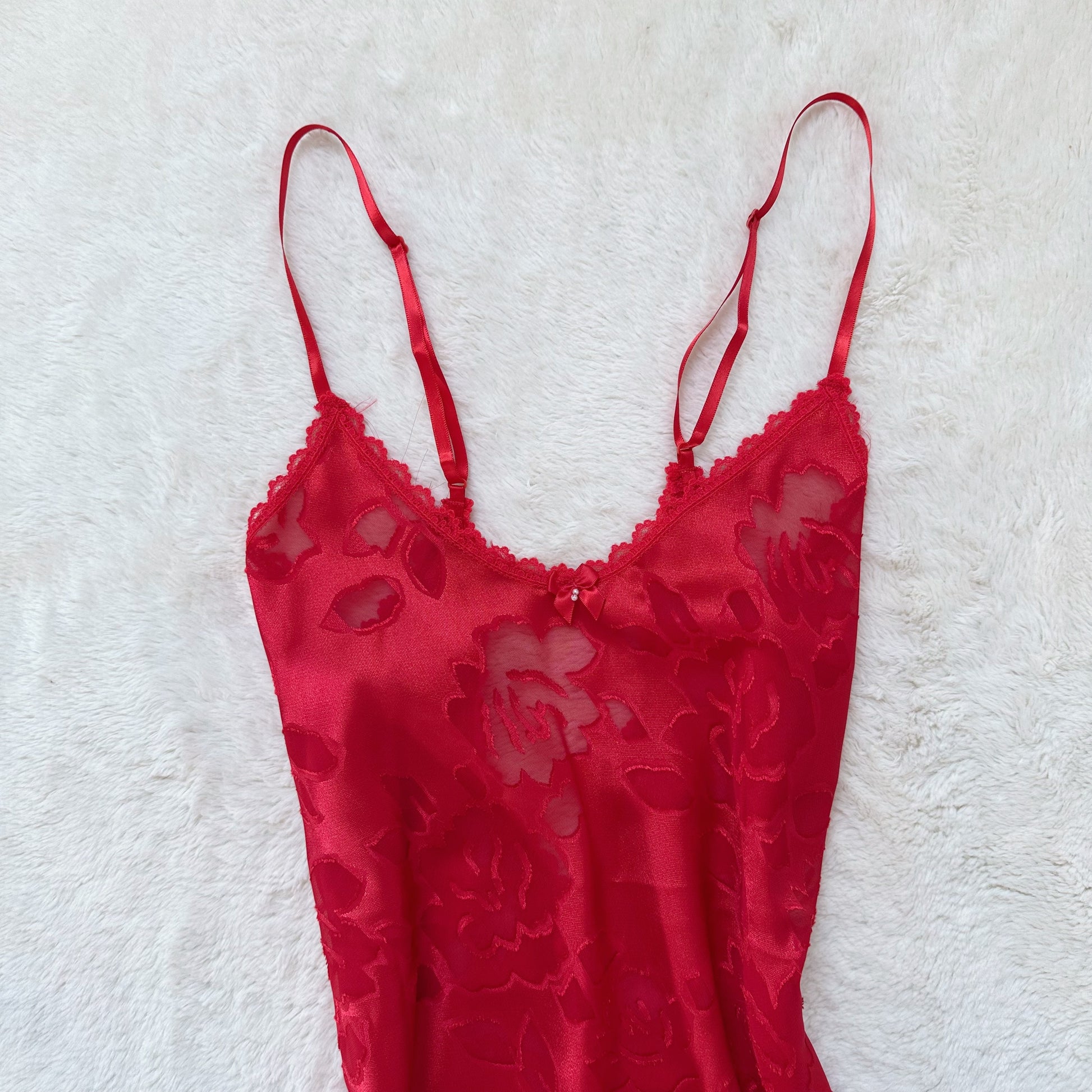 sheer red floral slip with lace trim and a dainty baby bow appliqué in the center, pearl detail, and satin ribbon straps