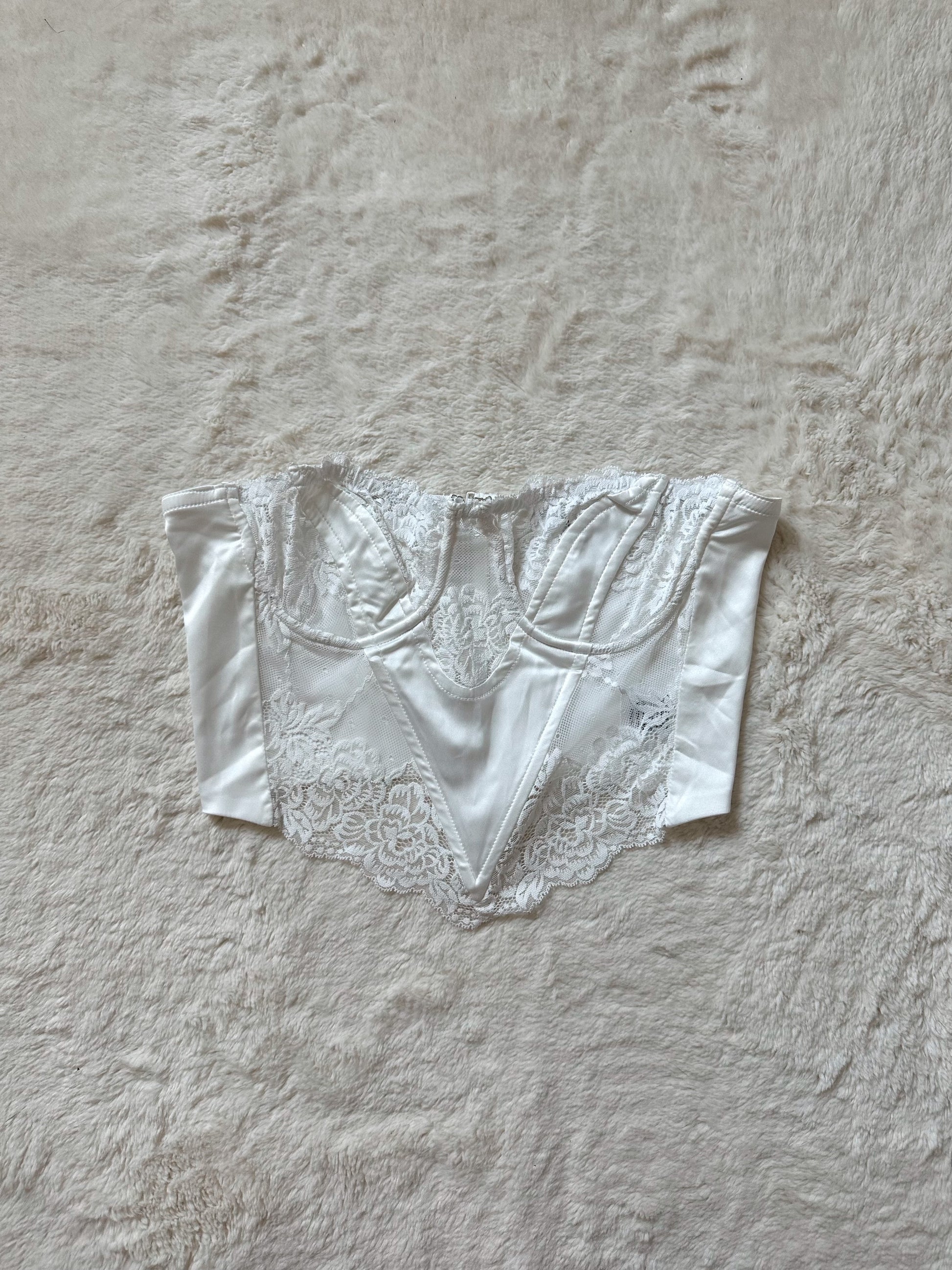 white strapless corset top with floral lace accents, eyelet mesh detailing, and a zipper with hook and eye closure in the back