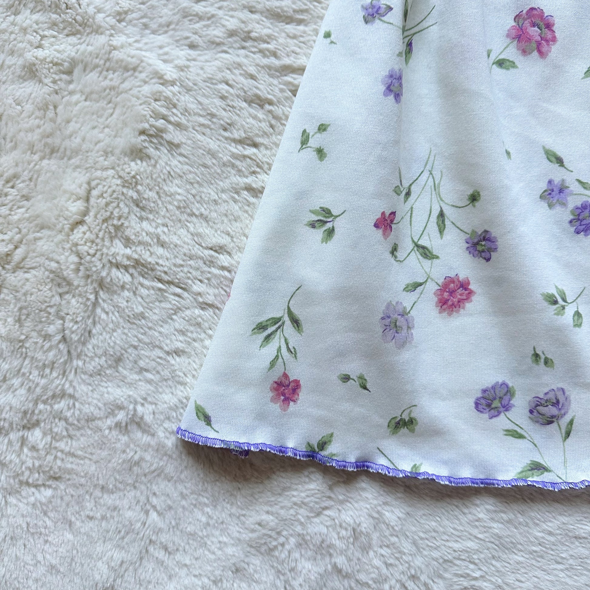 ivory dress with purple, pink, and green floral print, a ruched milkmaid bust, and a satin decorative bow in the center