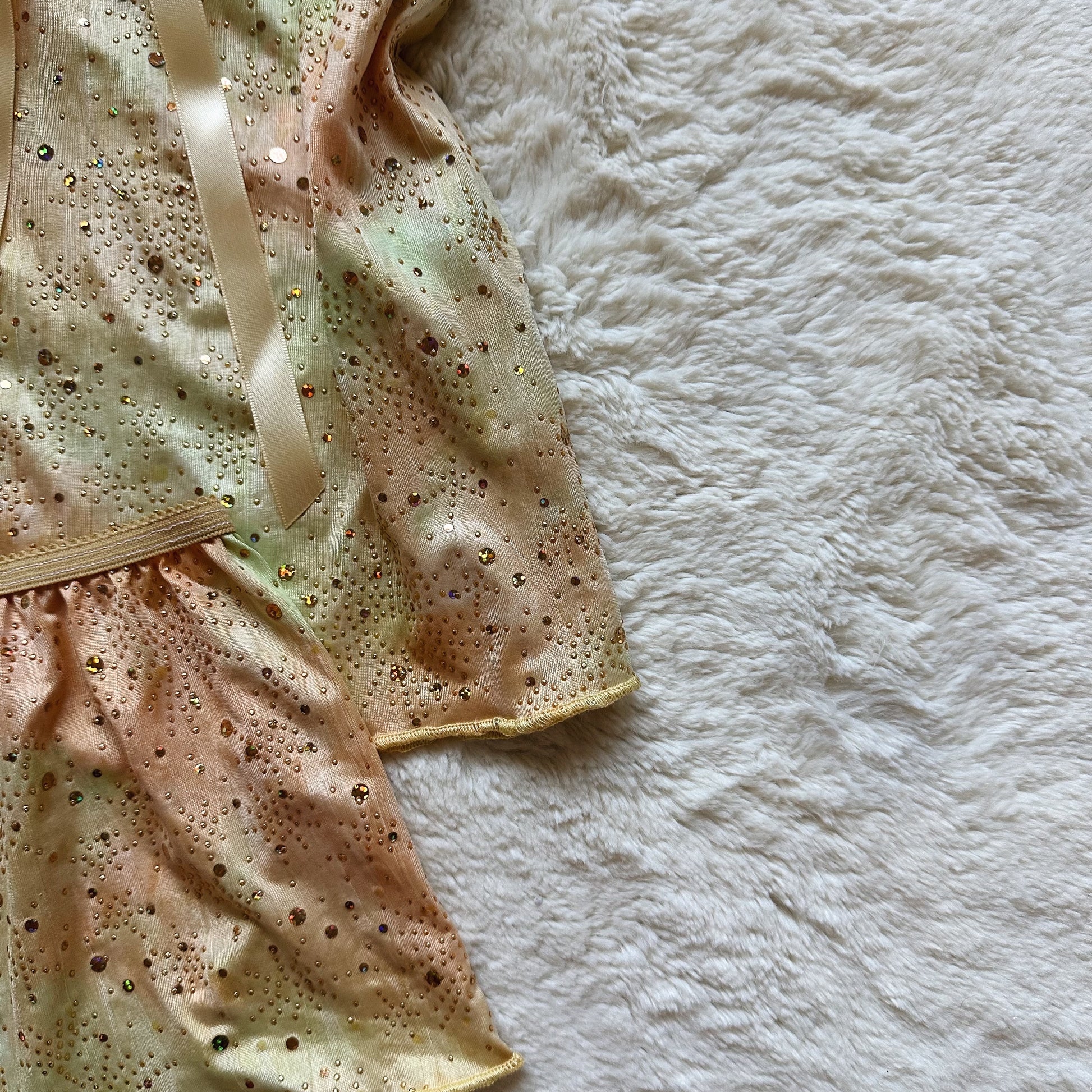 yellow and green silky-feel tank with gold rhinestone embellishments, lace trim, and a satin decorative bow in the center, completed with matching panties to pair with