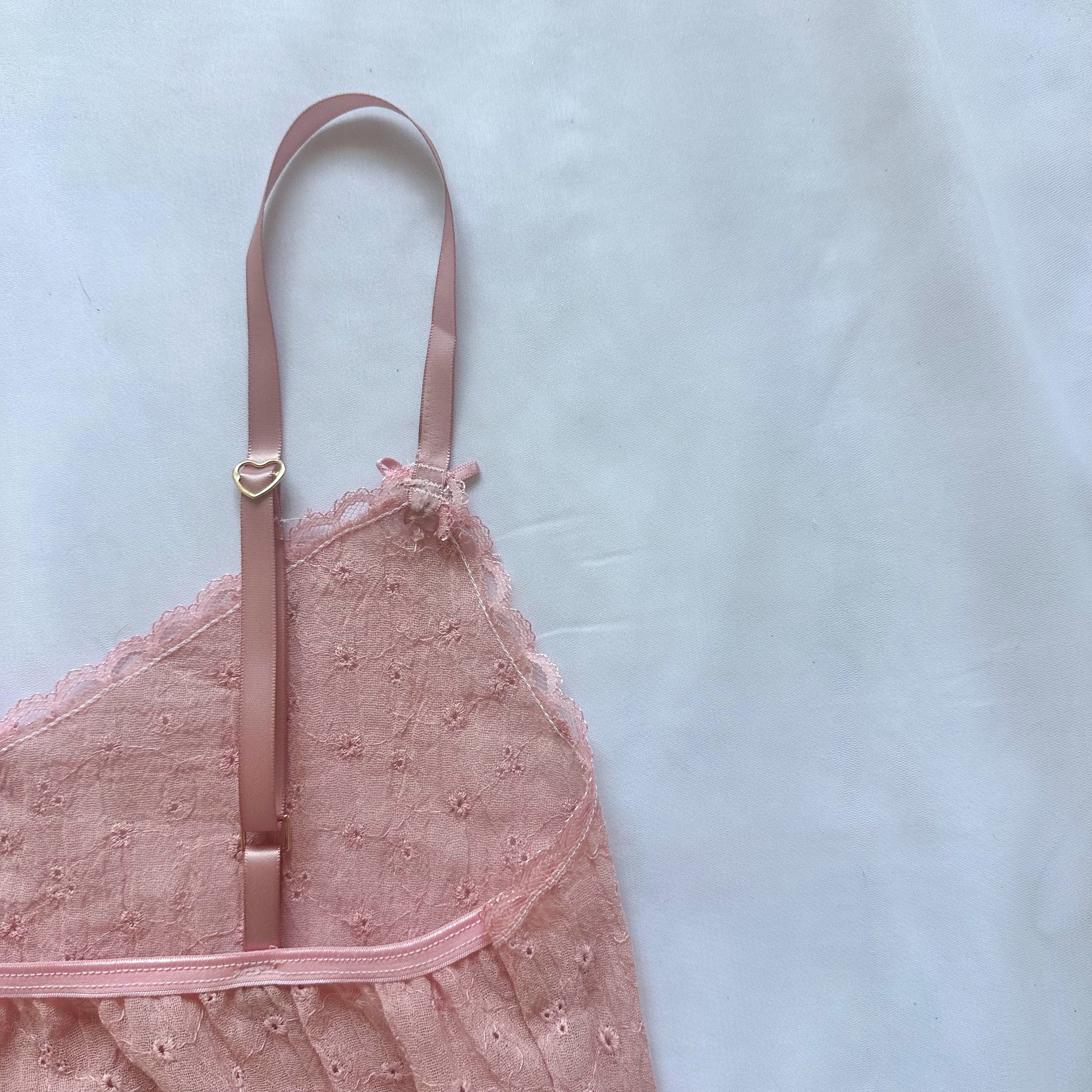 dusty rose pink 100% cotton eyelet camisole with floral embroidery, lace trim, and rosette baby bow appliqués, completed with satin ribbon adjustable straps featuring a metal heart adjuster, and matching panties to pair with