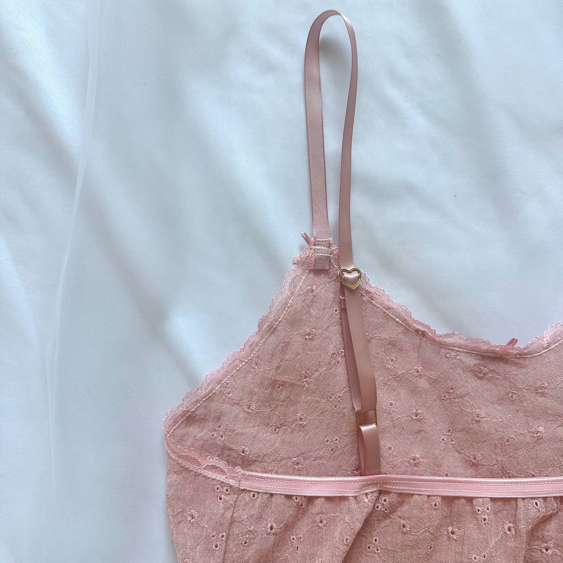 dusty rose pink 100% cotton eyelet micro mini slip dress with floral embroidery, lace trim, and rosette baby bow appliqués, completed with two slits, satin ribbon adjustable straps featuring a metal heart adjuster, and matching panties to pair with