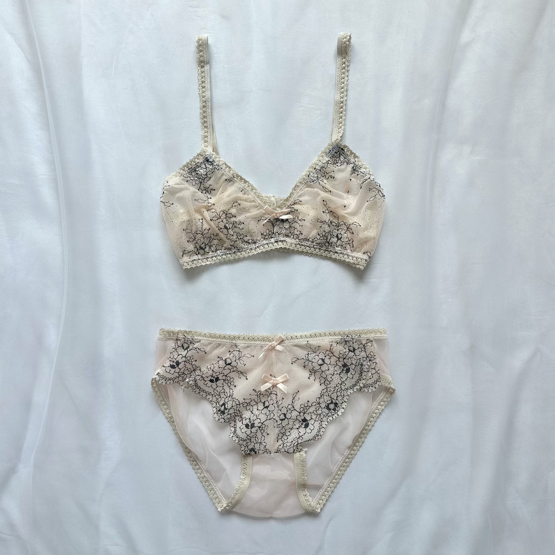 ivory mesh eyelet bralette with black floral detailing, lace trim, and a dainty baby bow appliqué in the center, completed with matching panties to pair with